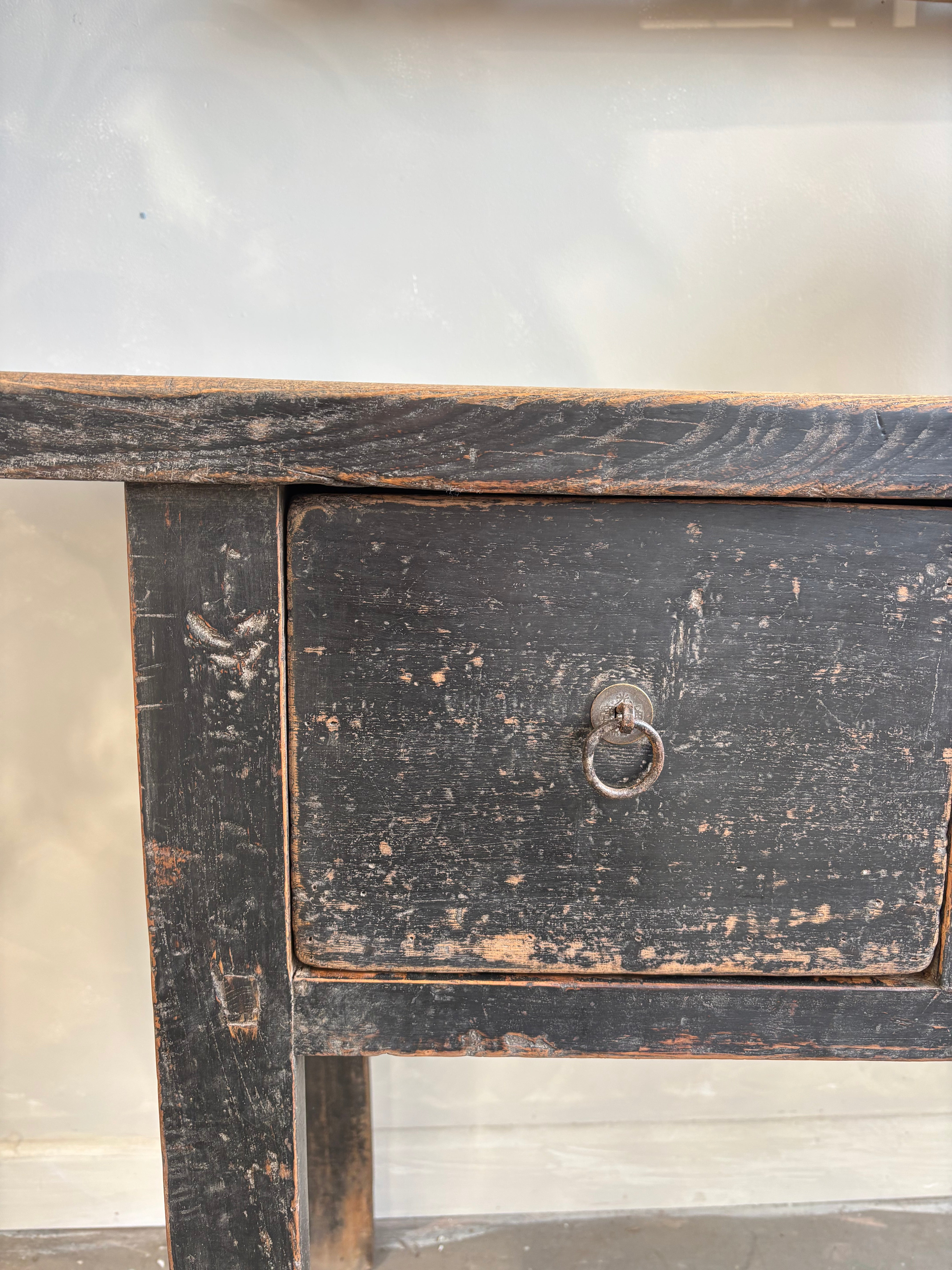 An authentic antique with a rustic, time-worn top, this piece carries all the unique marks and textures that only timber aged over a century can offer. A true statement of history and style for your home.