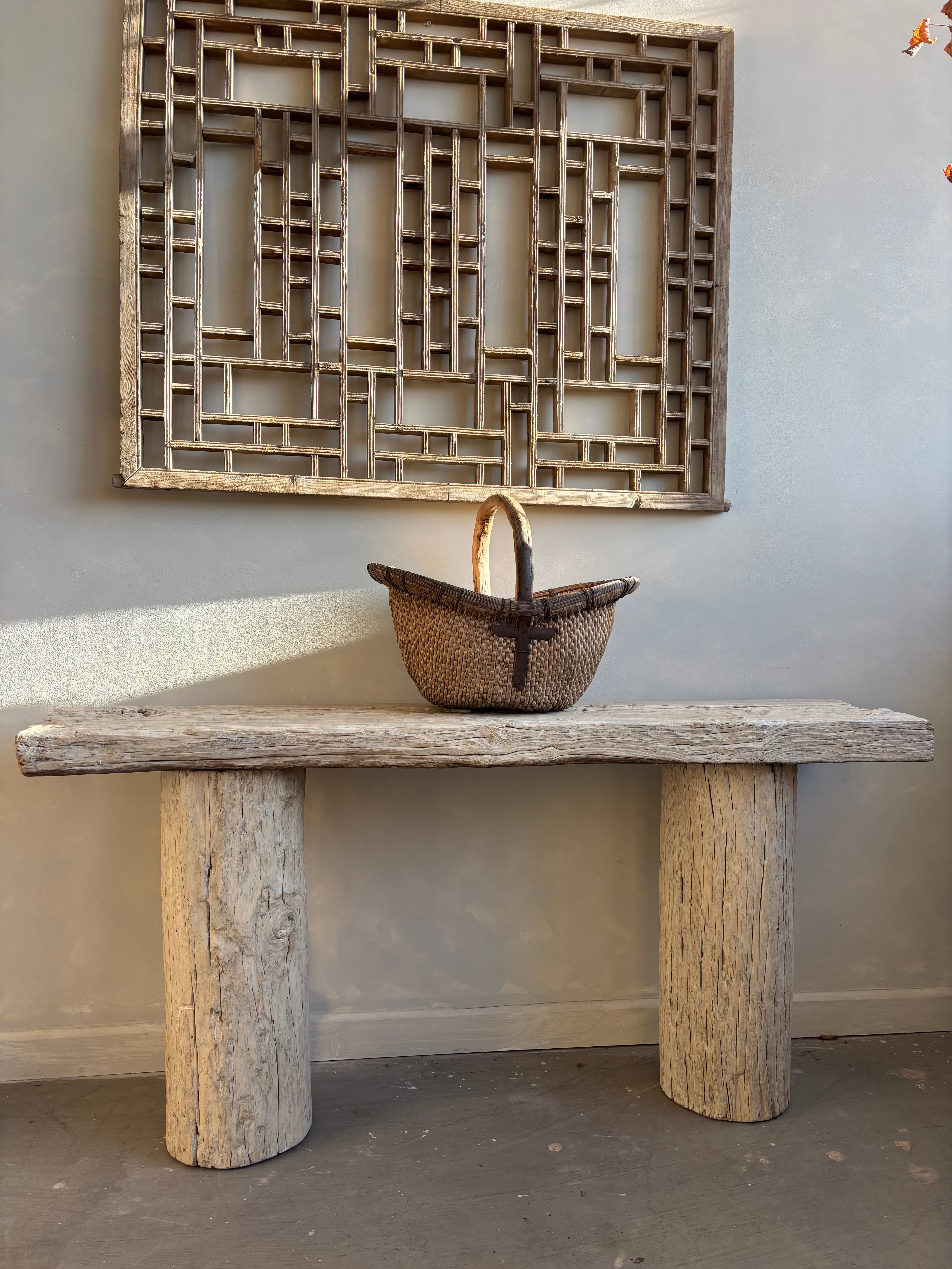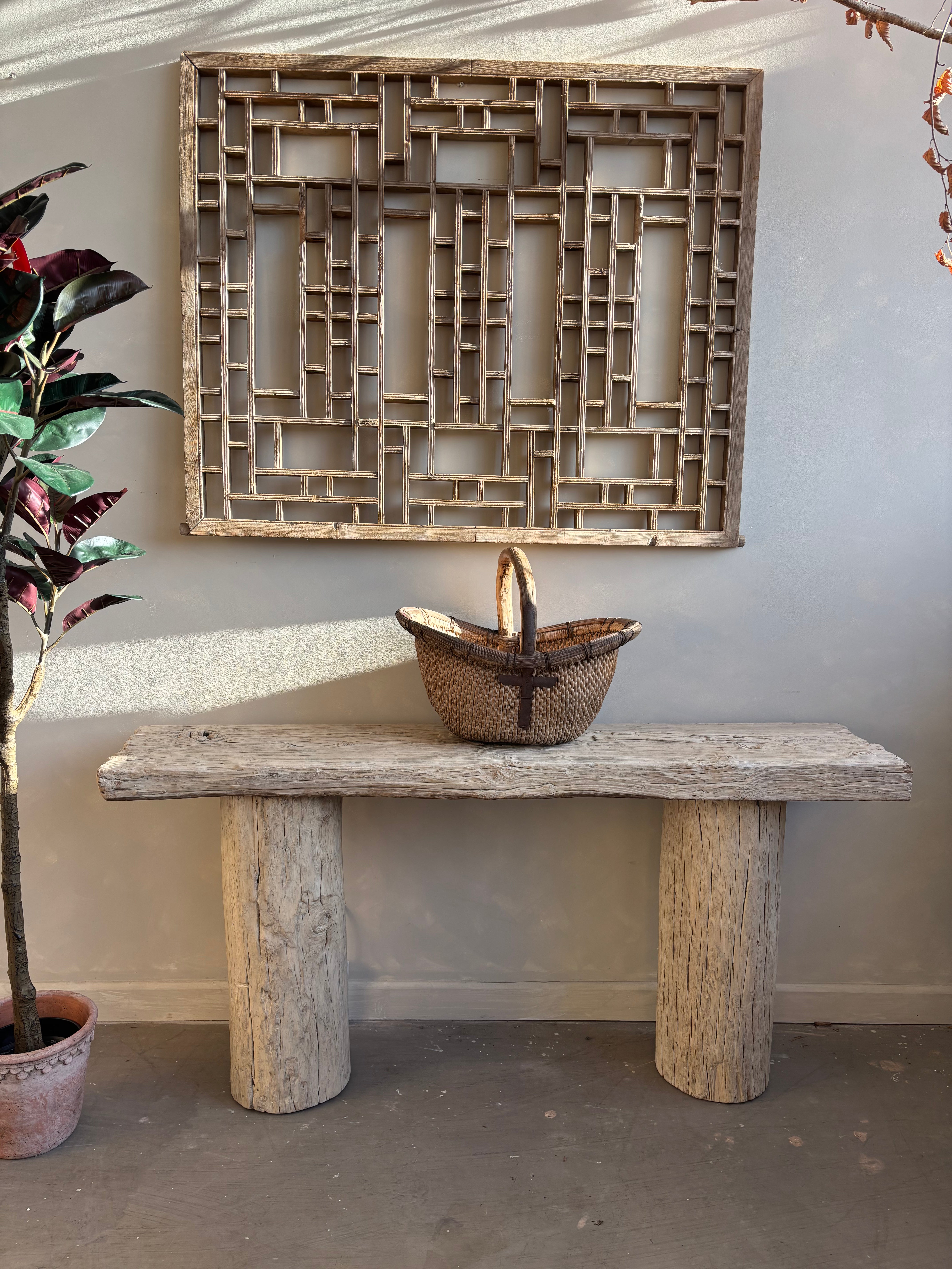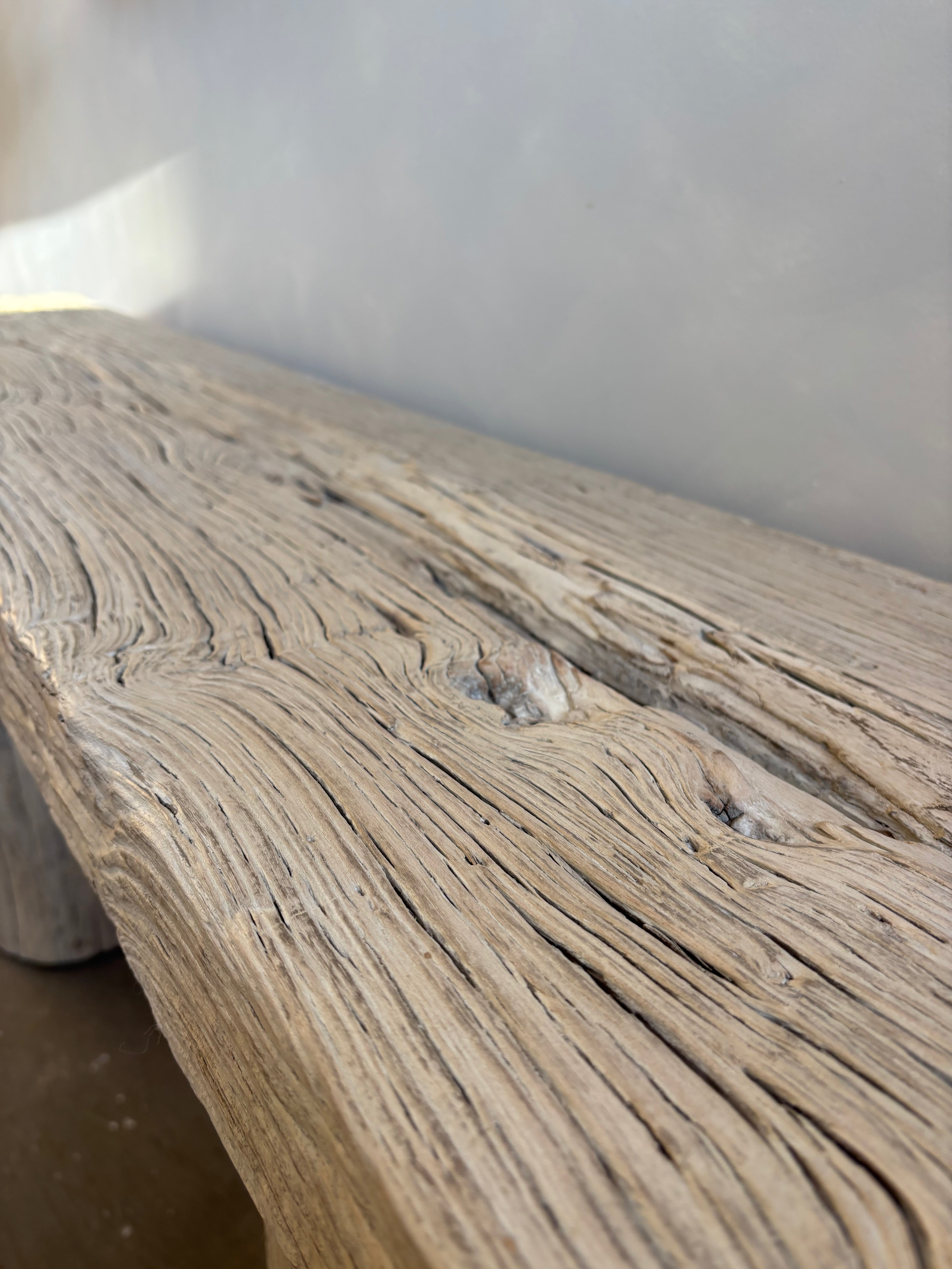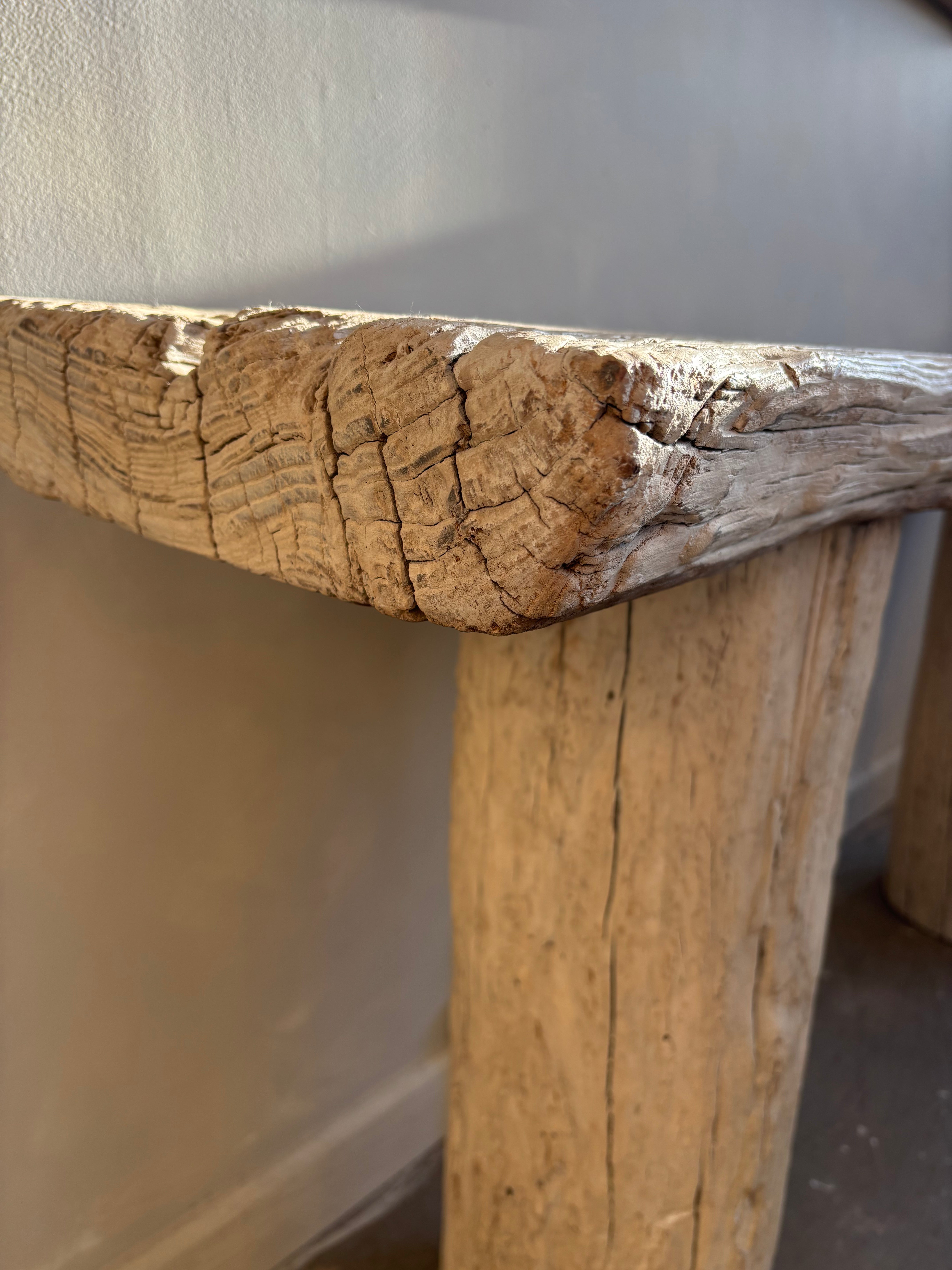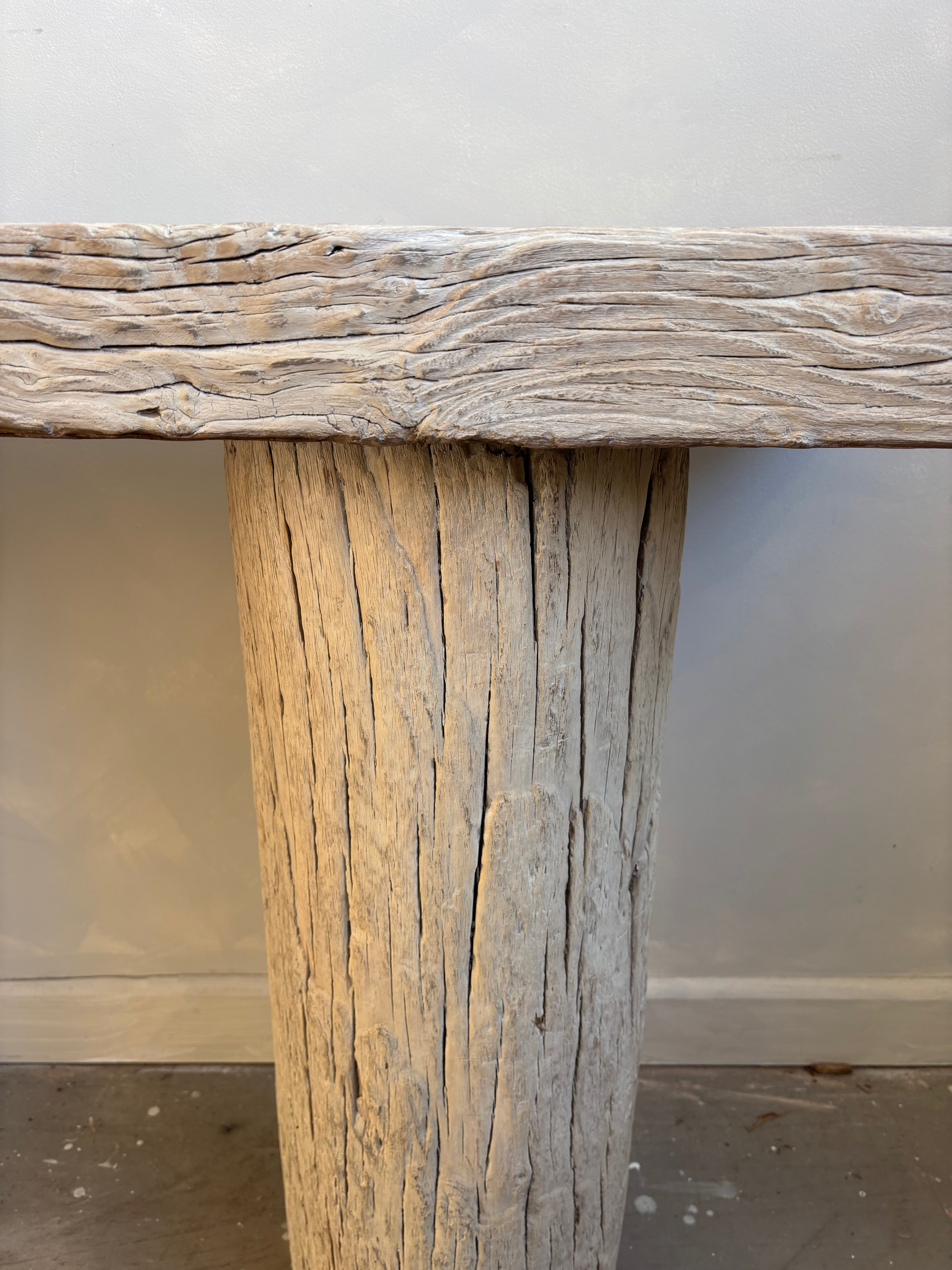 This stunning elm console is reclaimed from an old elm tree trunk that has been disregarded. It will transform your living space with it distinctive beauty, organic and unique form and slight white washed finish. Its perfectly imperfect , true Wabi Sabi style a real statement console table.