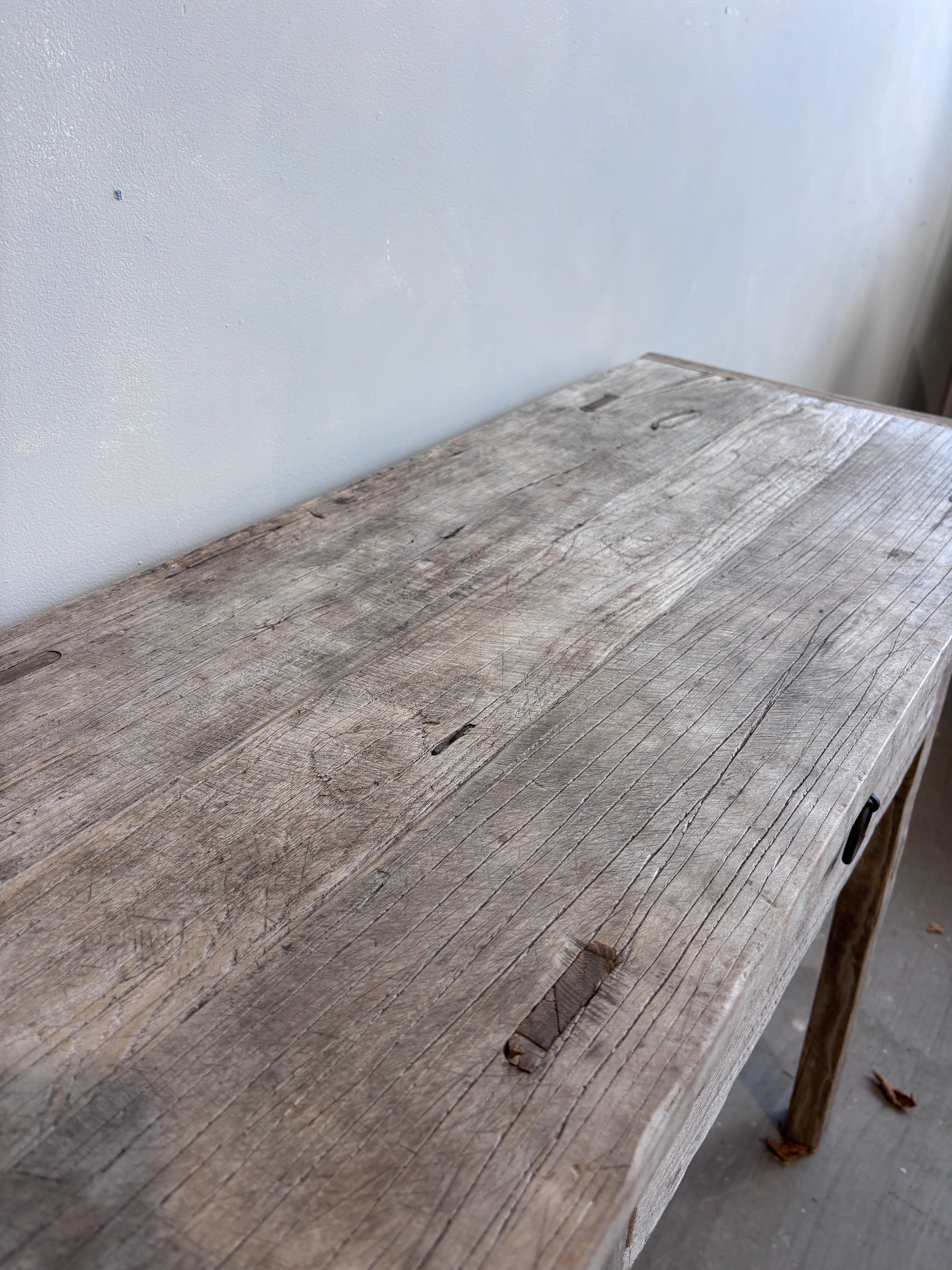 An authentic vintage piece with a rustic, time-worn top, this piece carries all the unique marks and textures that only aged timber can offer. A true statement of history and style for your home.