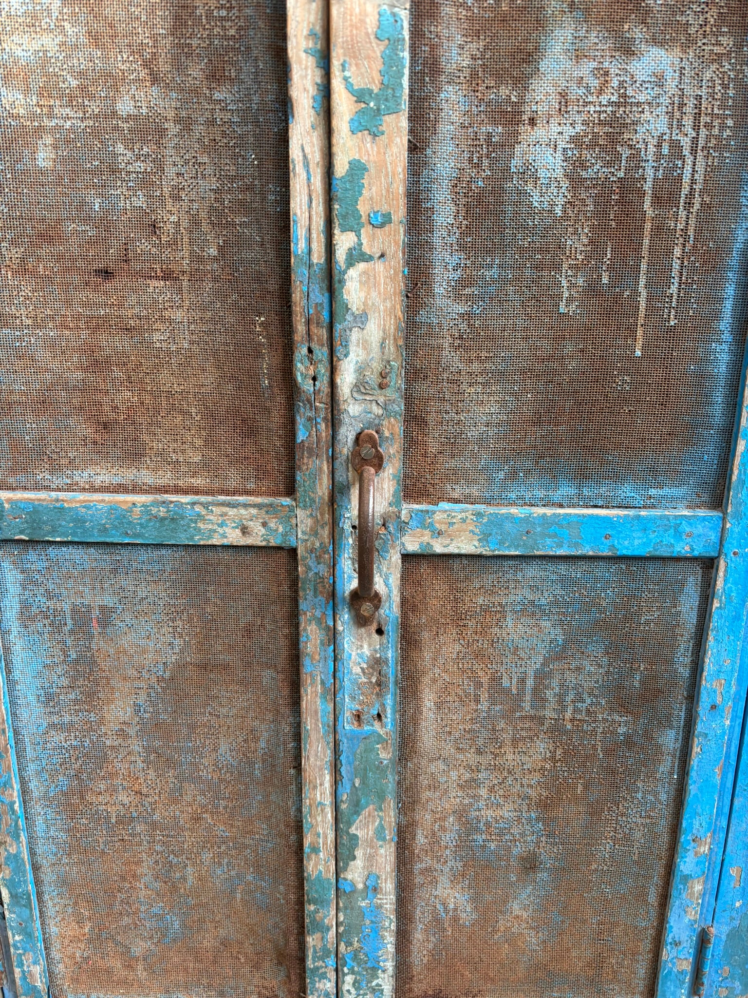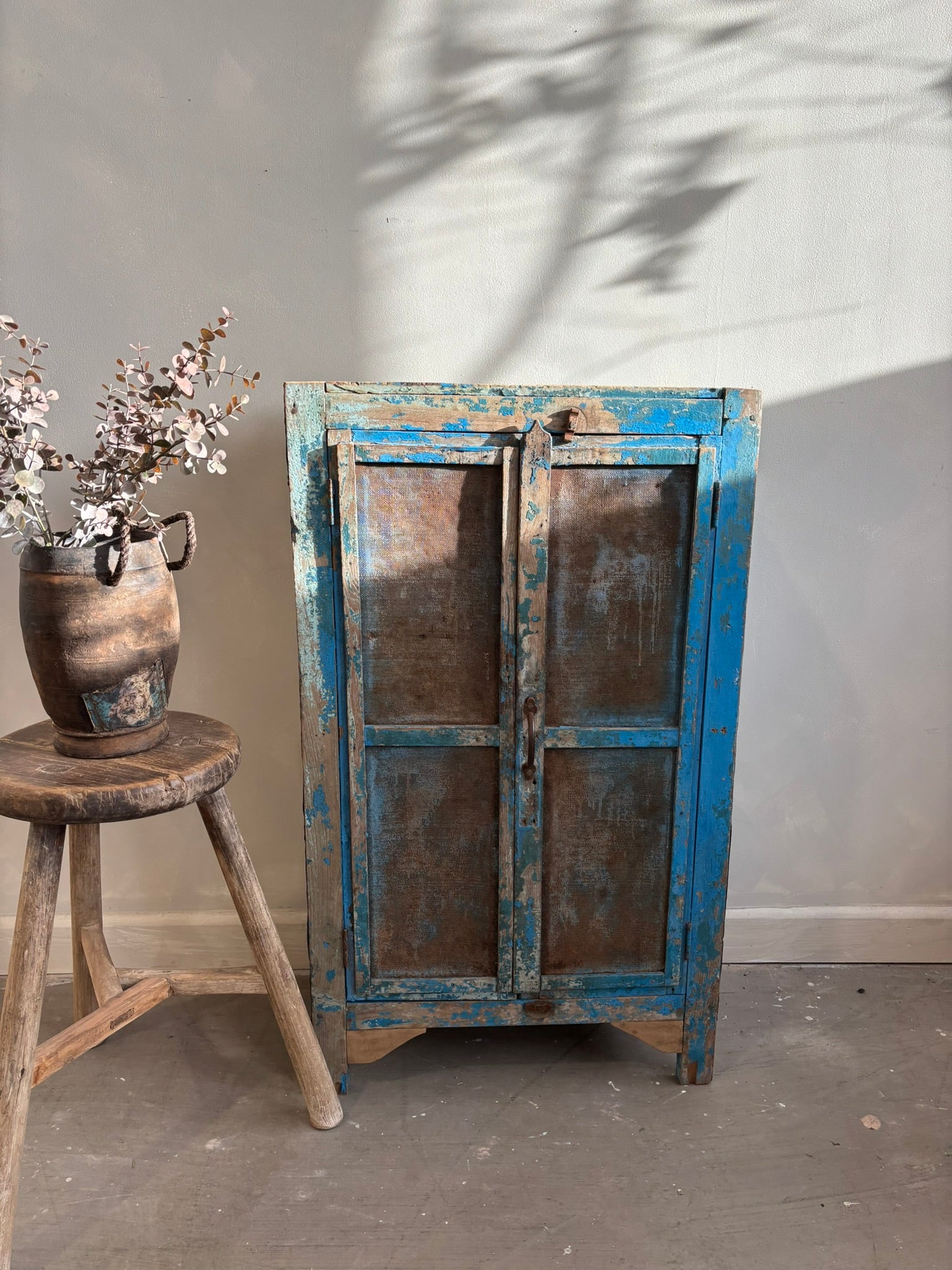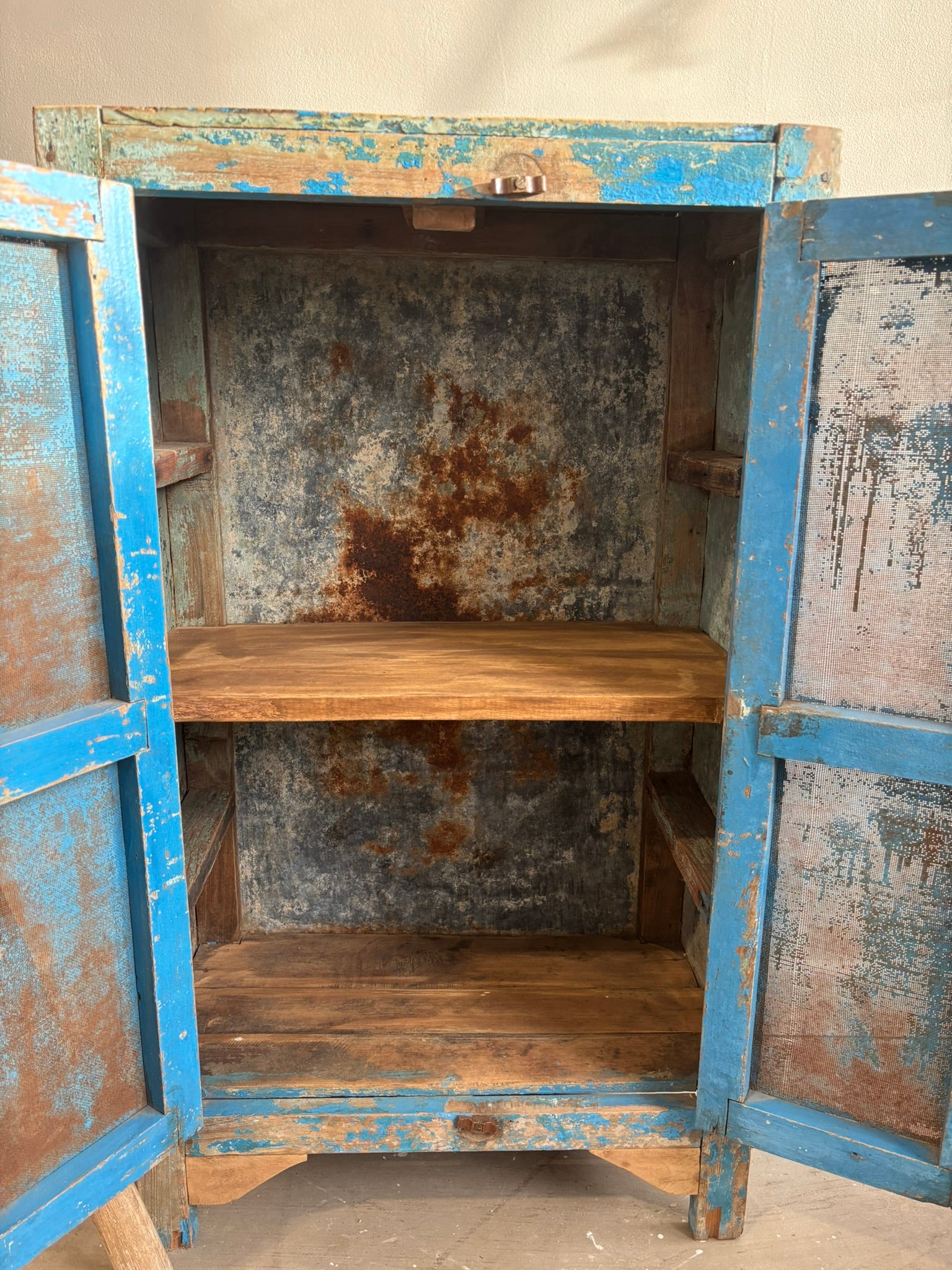 Infuse your home with heritage rich rustic elegance through this Vintage Indian Blue Cupboard, a captivating piece that reflects traditional Indian craftsmanship and rustic soul. Handcrafted from solid wood and metal back and sides, with its original metal mesh front panels. Its weathered blue finish tells a story of age and authenticity, adding depth and warmth to any interior.