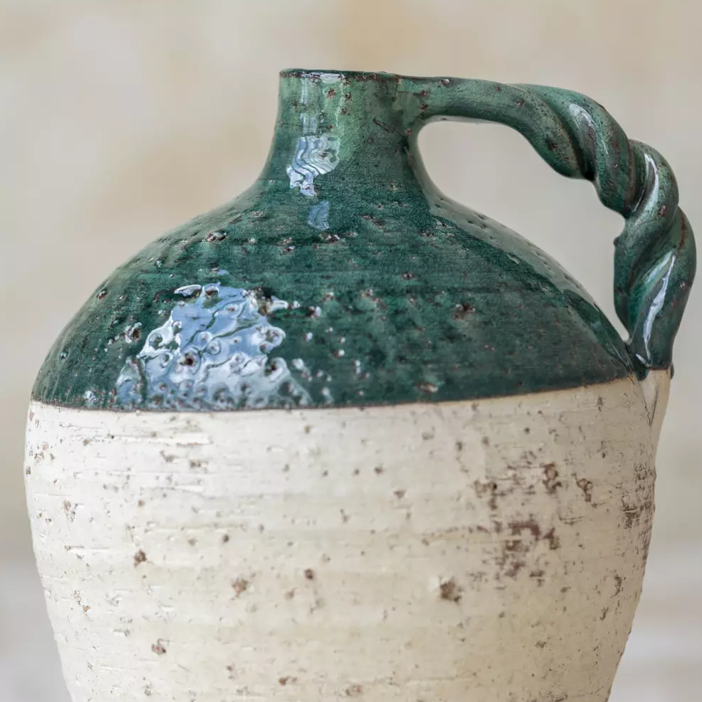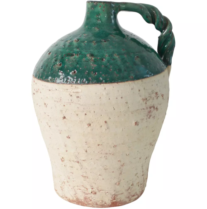 Enhance your space with our charming ceramic vase featuring handles and a beautifully glazed green top half. This elegant vase combines practicality with a touch of artistry. The vibrant green glaze on the upper portion adds a fresh, lively accent, while the sturdy handles provide ease of handling and a hint of vintage appeal. Perfect for displaying flowers, decorative branches, or as a standalone decorative piece, this handcrafted vase brings a natural, sophisticated touch to any room—whether indoors or outdoors.