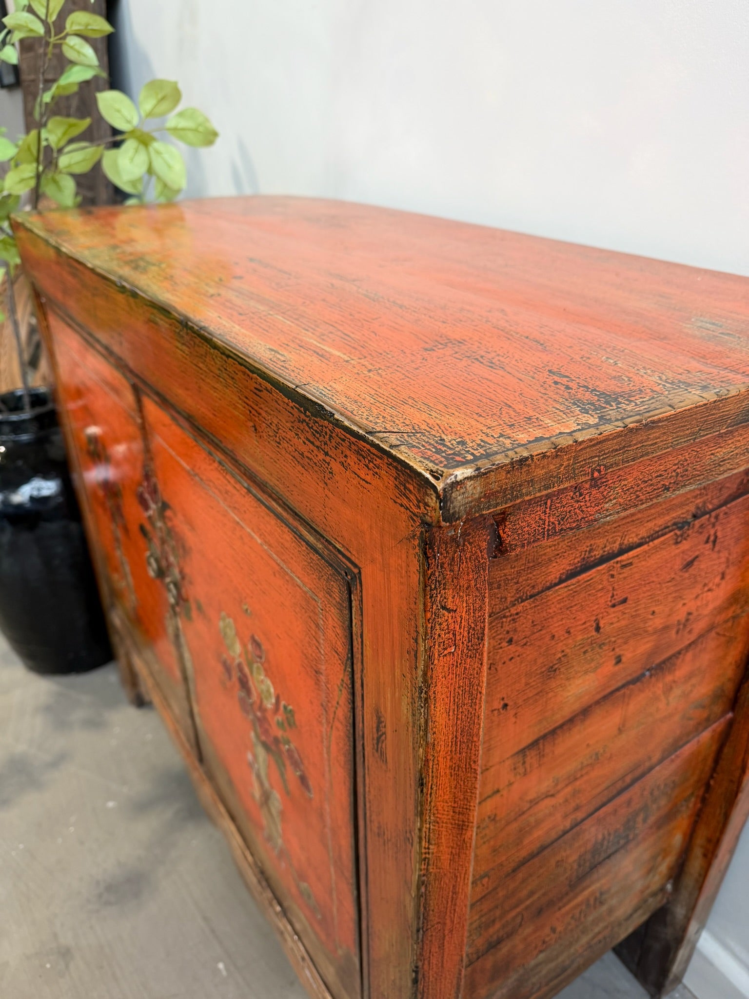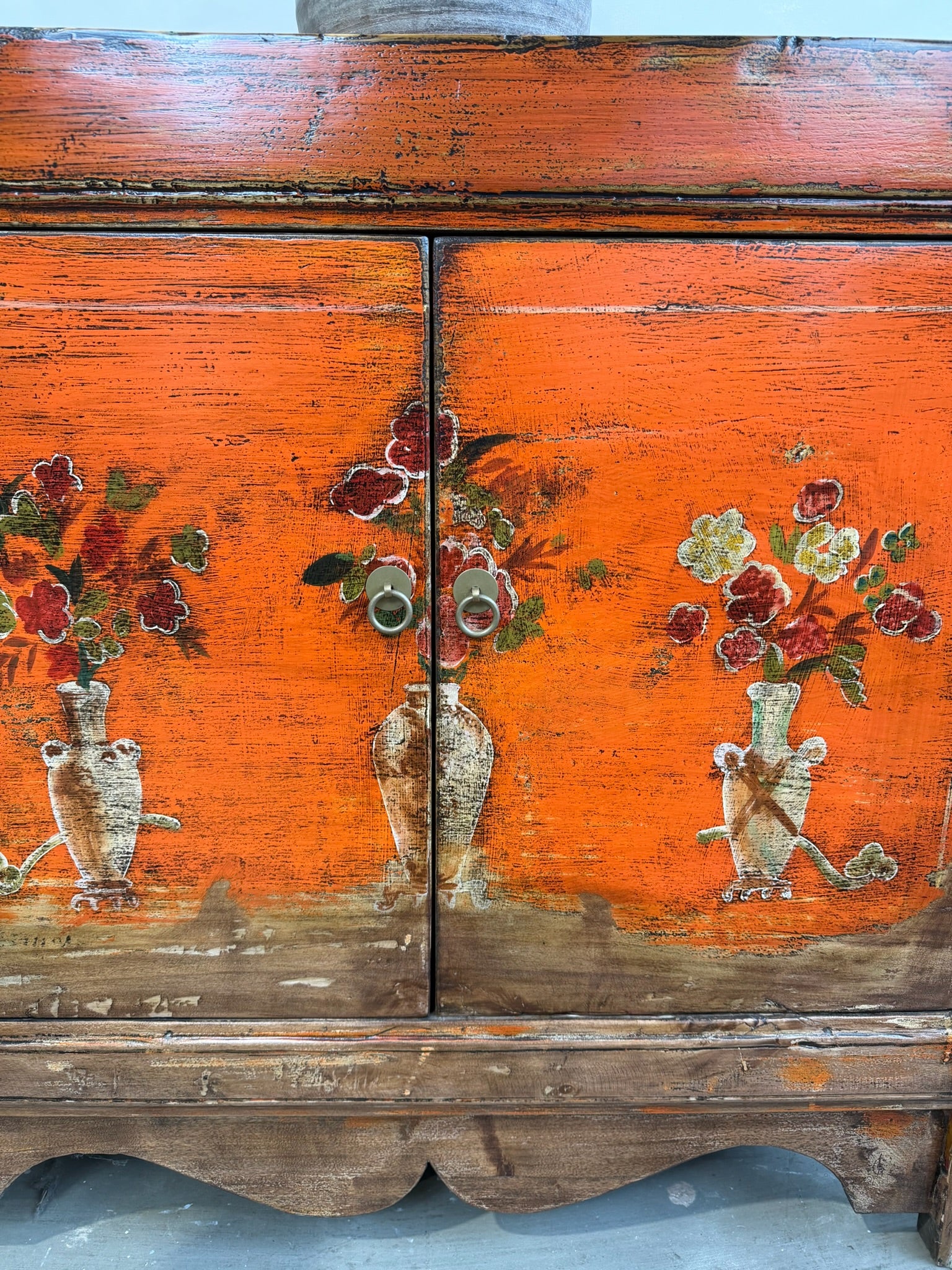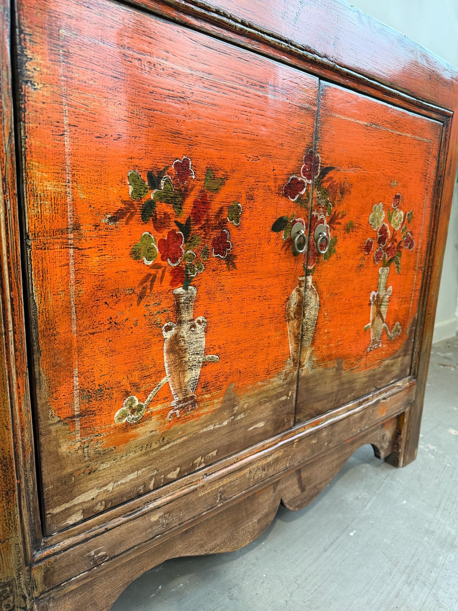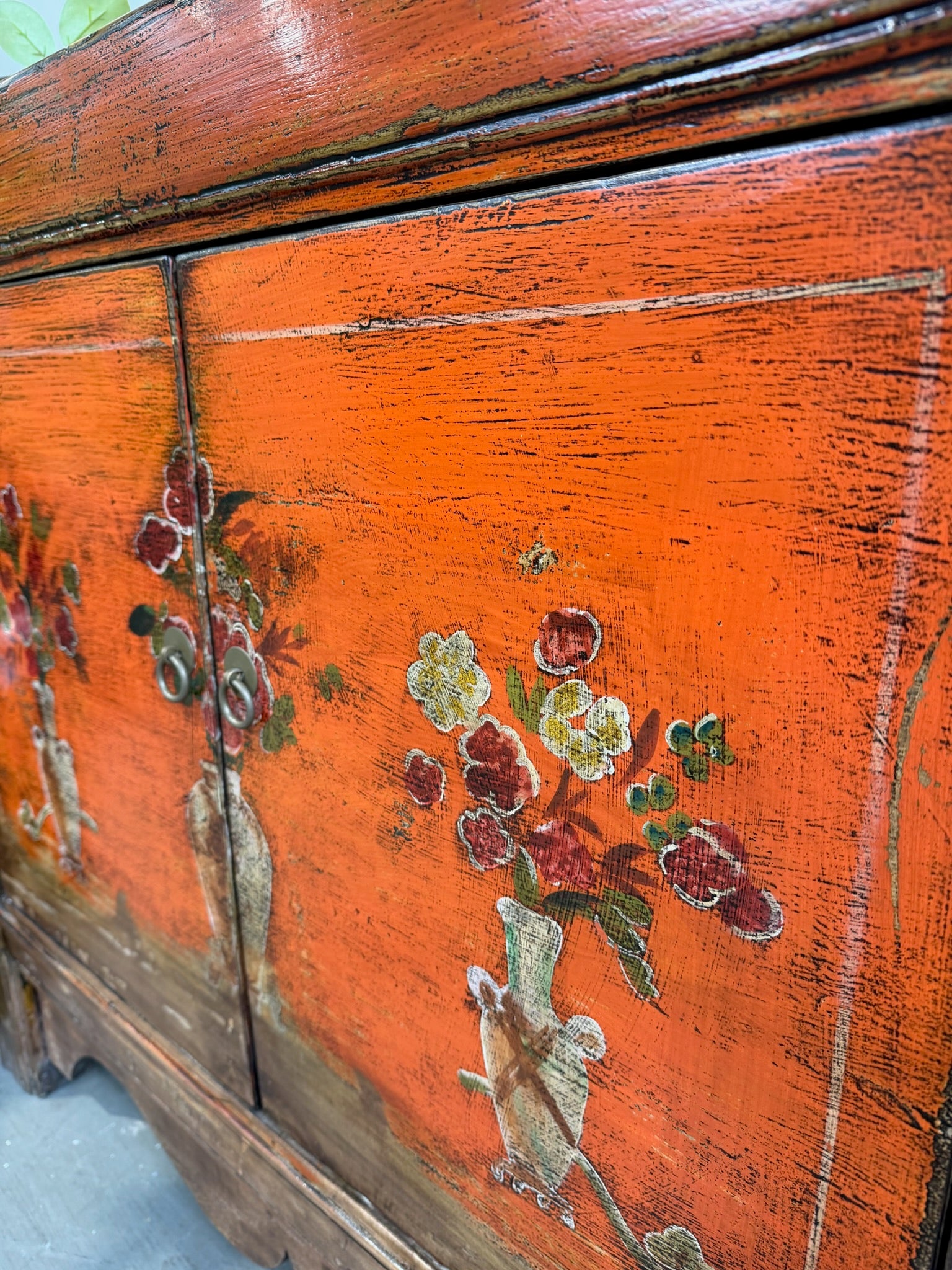 Infused with warmth and a sense of heritage, this lacquered cabinet is a striking restored antique from China’s Gansu province, crafted around 1920 from Chinese pine. Its radiant burnt orange lacquer finish feels both expressive and uplifting, enriched by the depth and character that only time honoured craftsmanship can create.