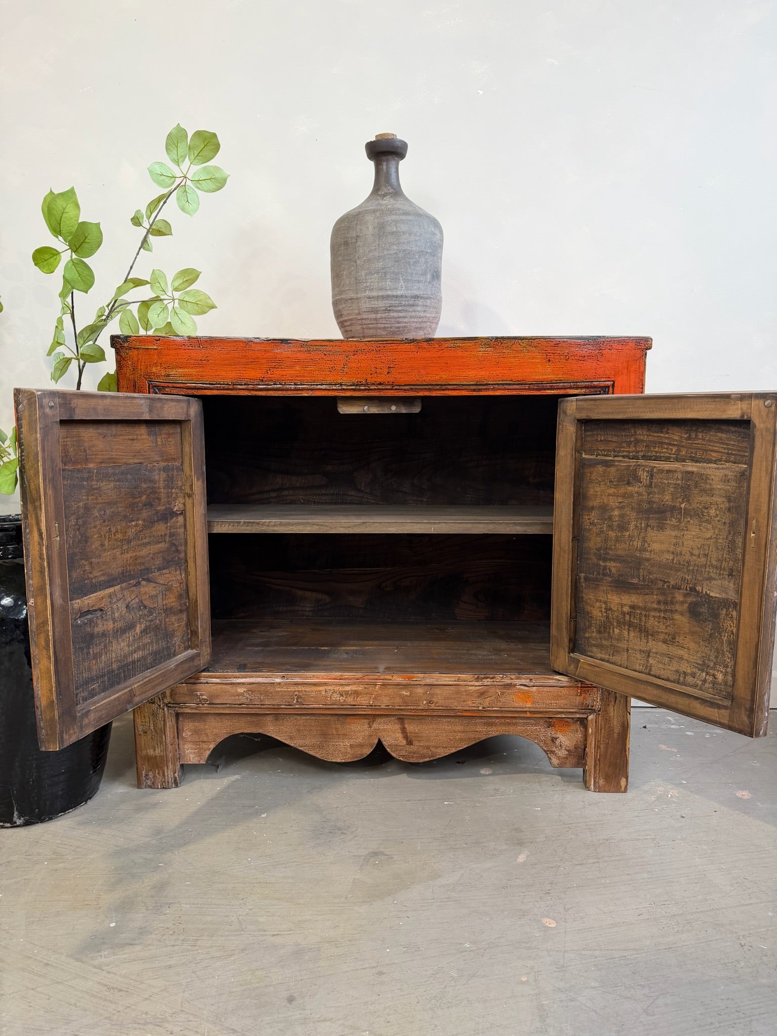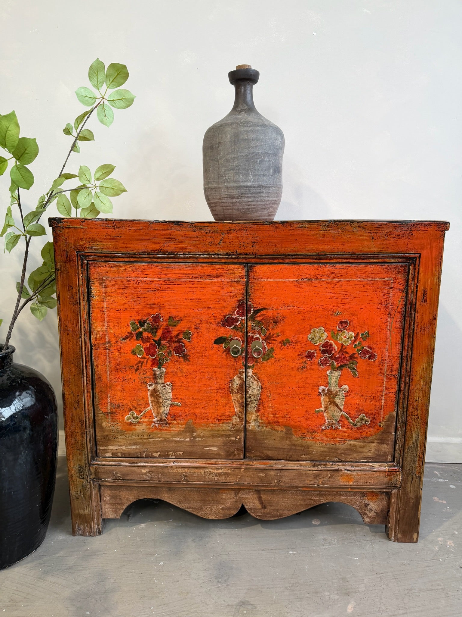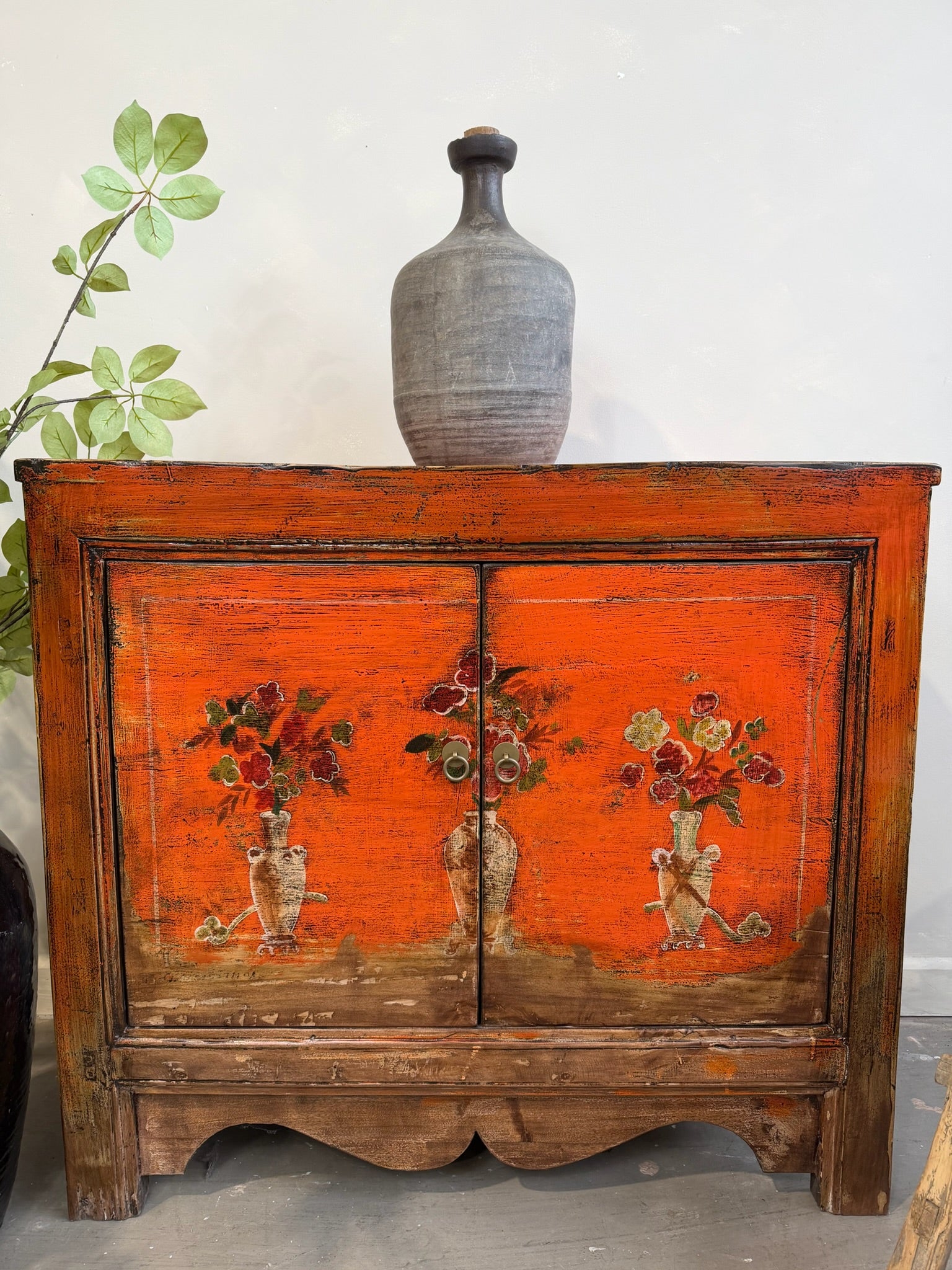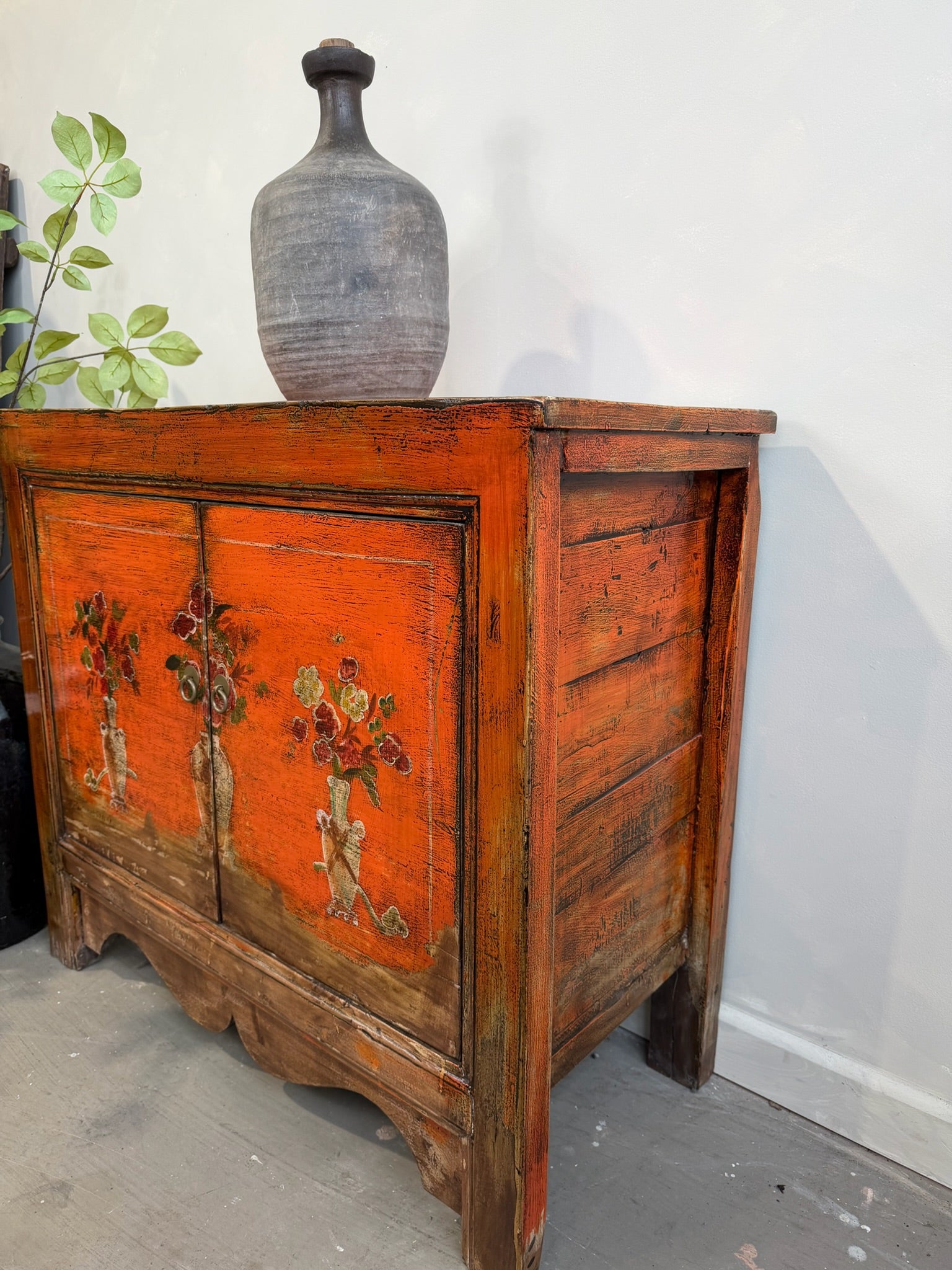 Infused with warmth and a sense of heritage, this lacquered cabinet is a striking restored antique from China’s Gansu province, crafted around 1920 from Chinese pine. Its radiant burnt orange lacquer finish feels both expressive and uplifting, enriched by the depth and character that only time honoured craftsmanship can create.