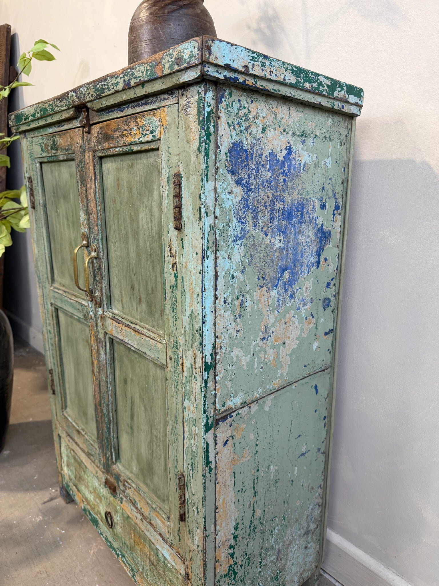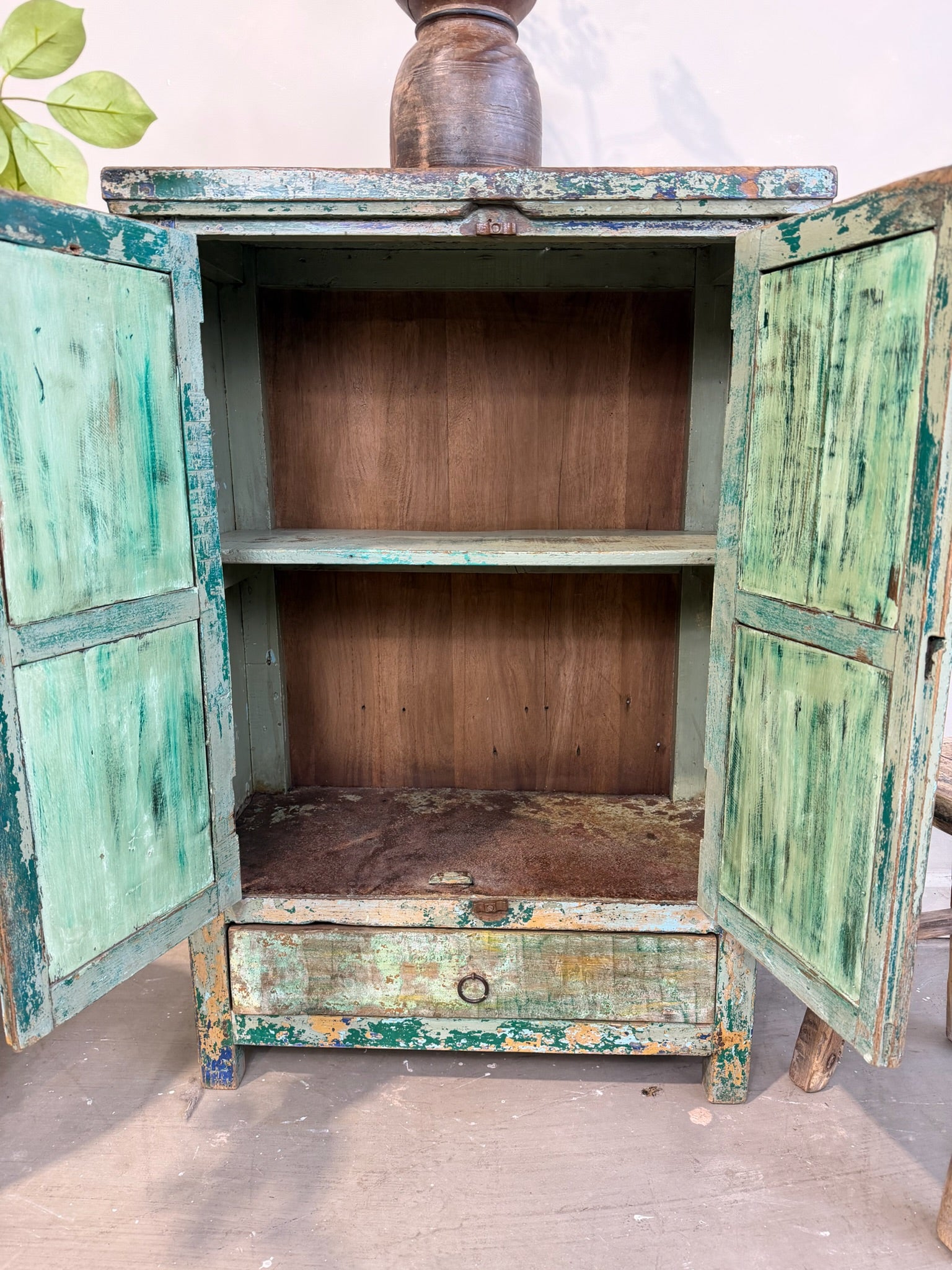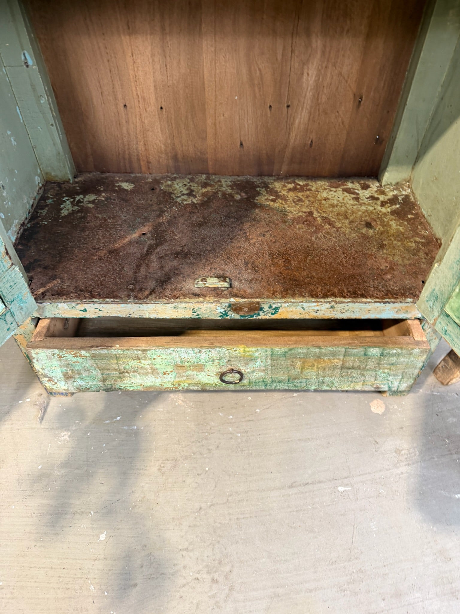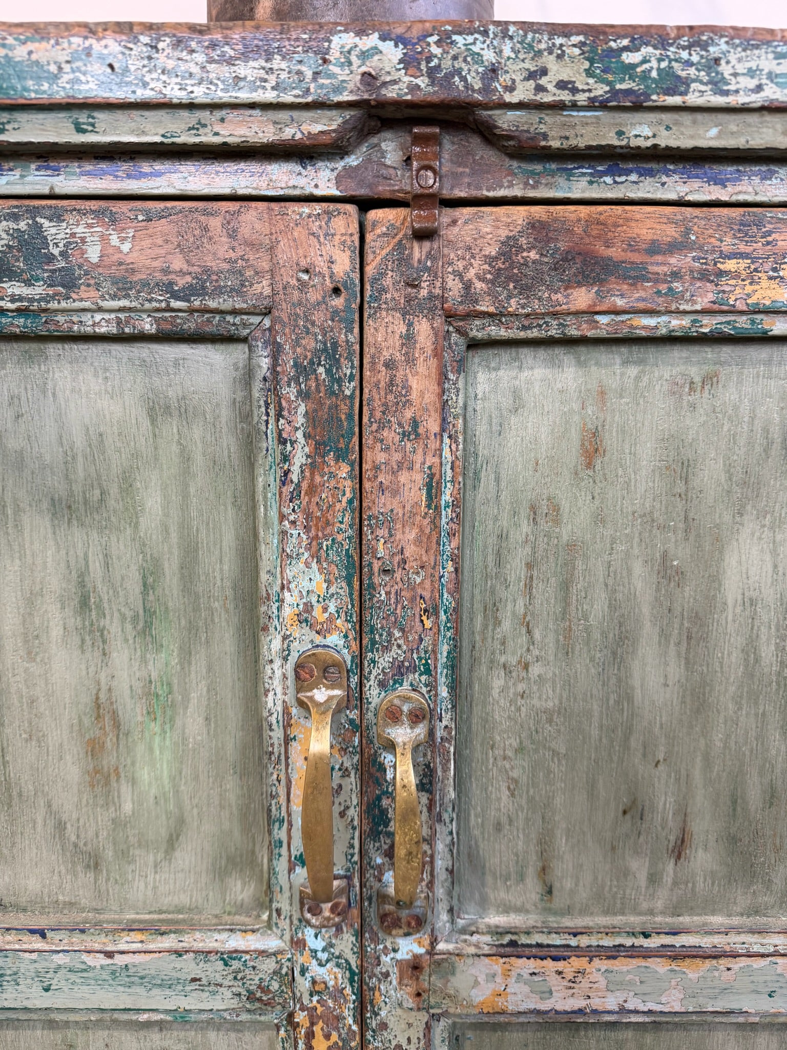 Infuse your home with heritage rich rustic elegance through this Vintage Indian Green & Blue Cupboard, a captivating piece that reflects traditional Indian craftsmanship and rustic soul. Handcrafted from solid wood and metal back and sides, its weathered blue finish tells a story of age and authenticity, adding depth and warmth to any interior.