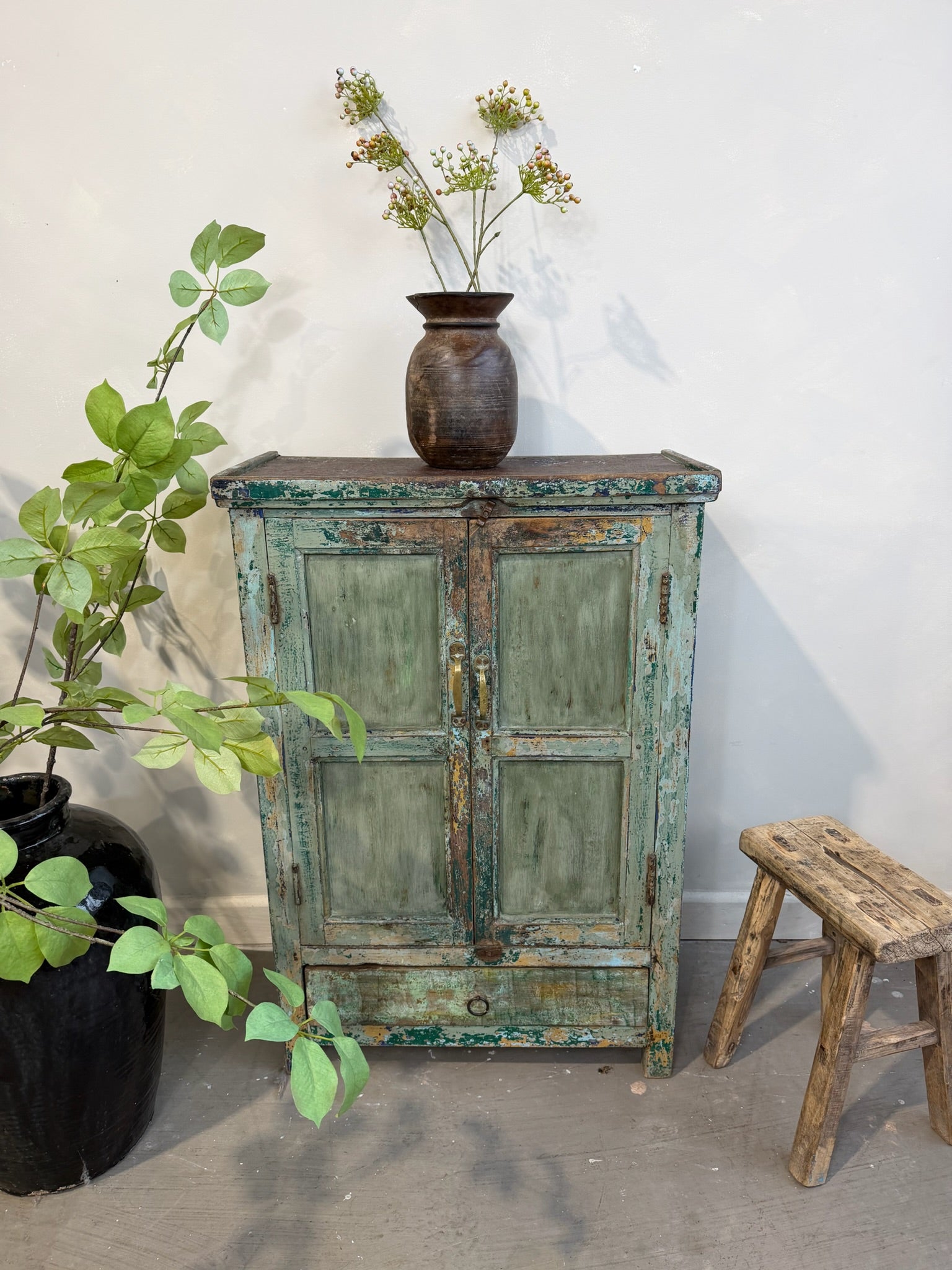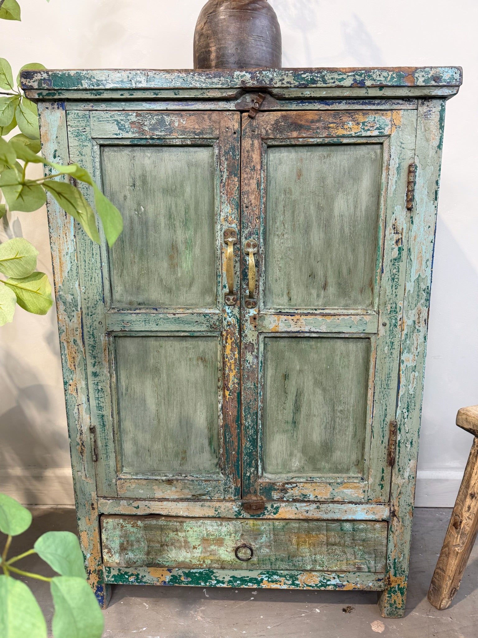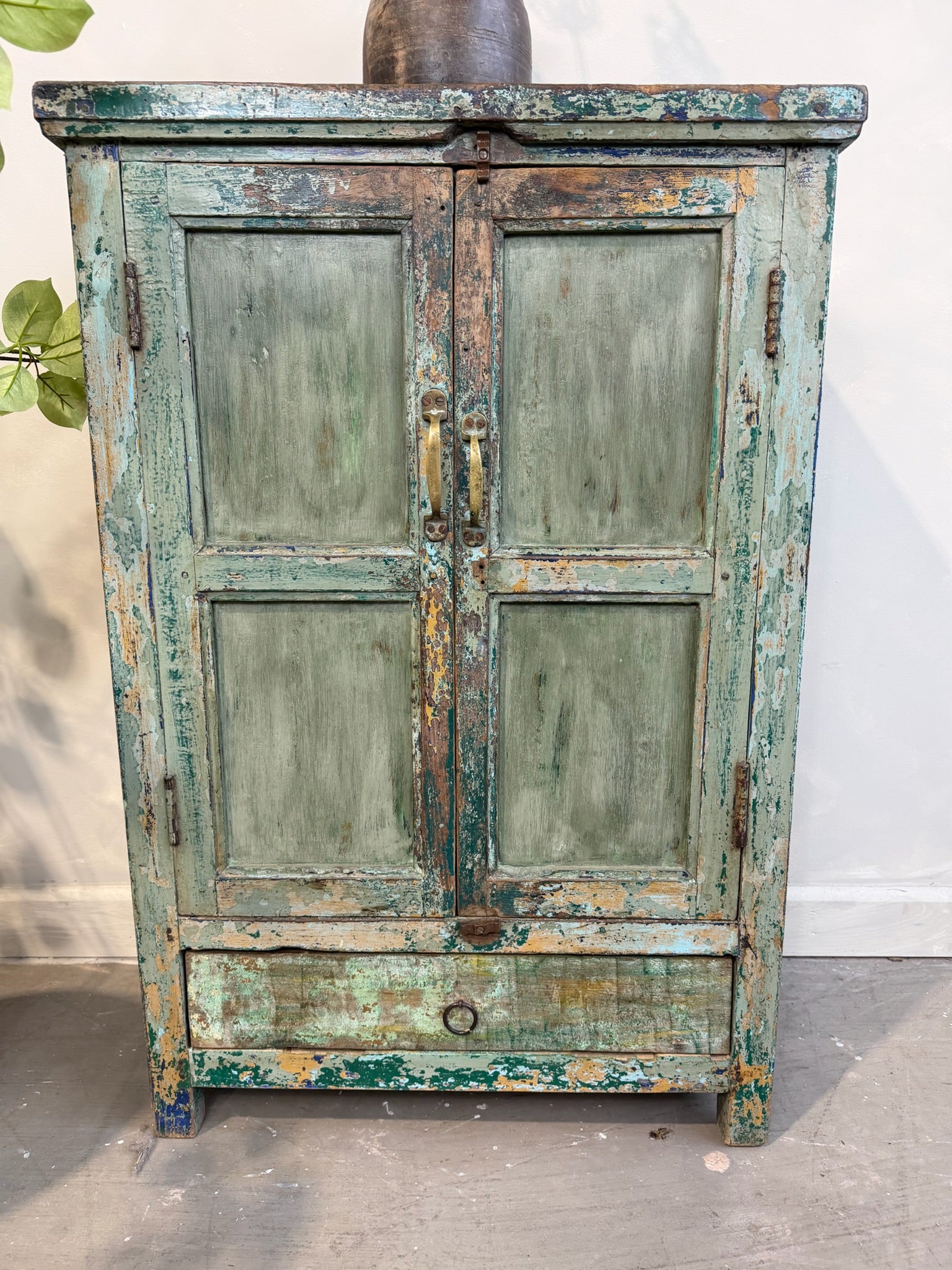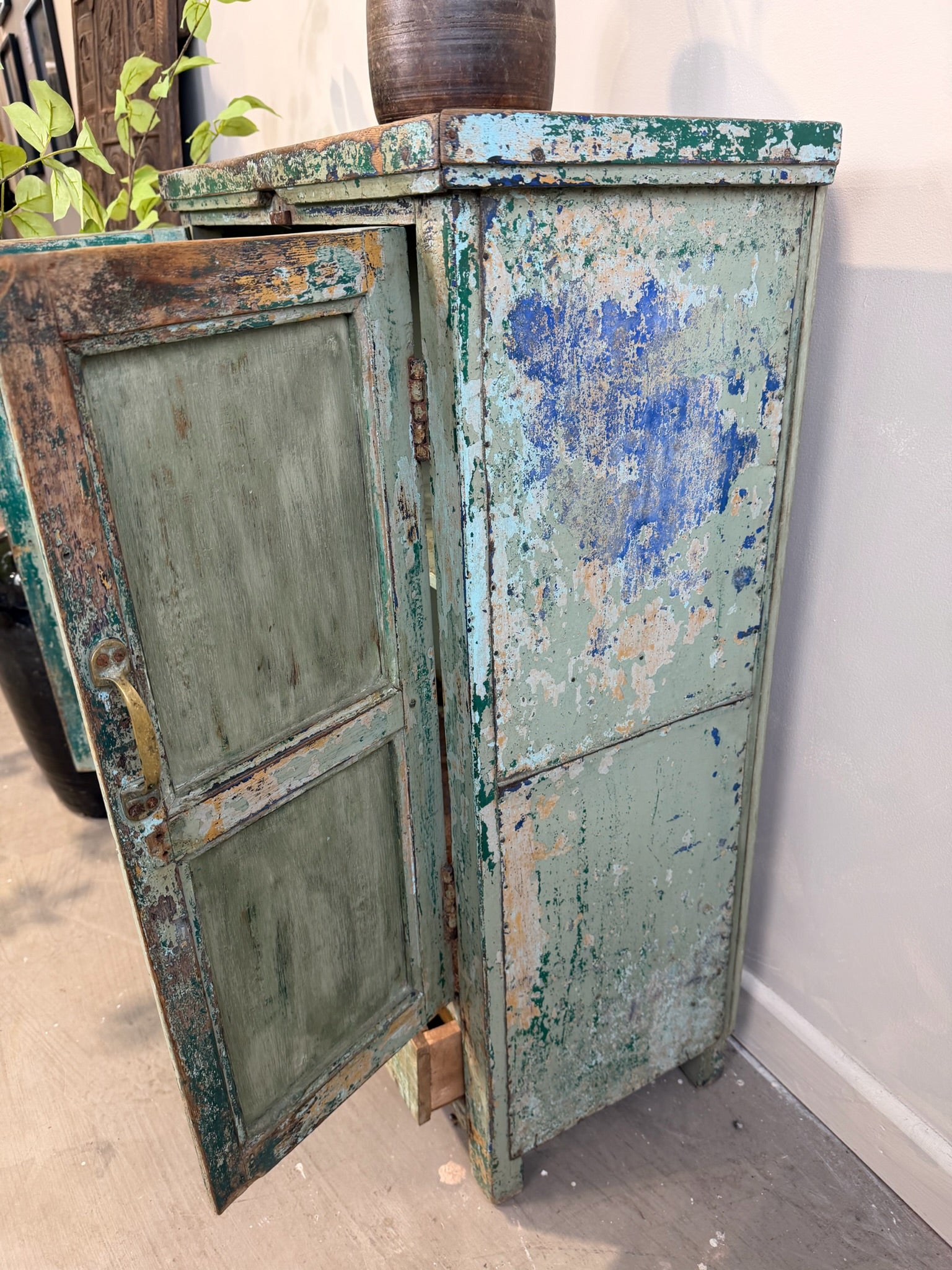 Infuse your home with heritage rich rustic elegance through this Vintage Indian Green & Blue Cupboard, a captivating piece that reflects traditional Indian craftsmanship and rustic soul. Handcrafted from solid wood and metal back and sides, its weathered blue finish tells a story of age and authenticity, adding depth and warmth to any interior.