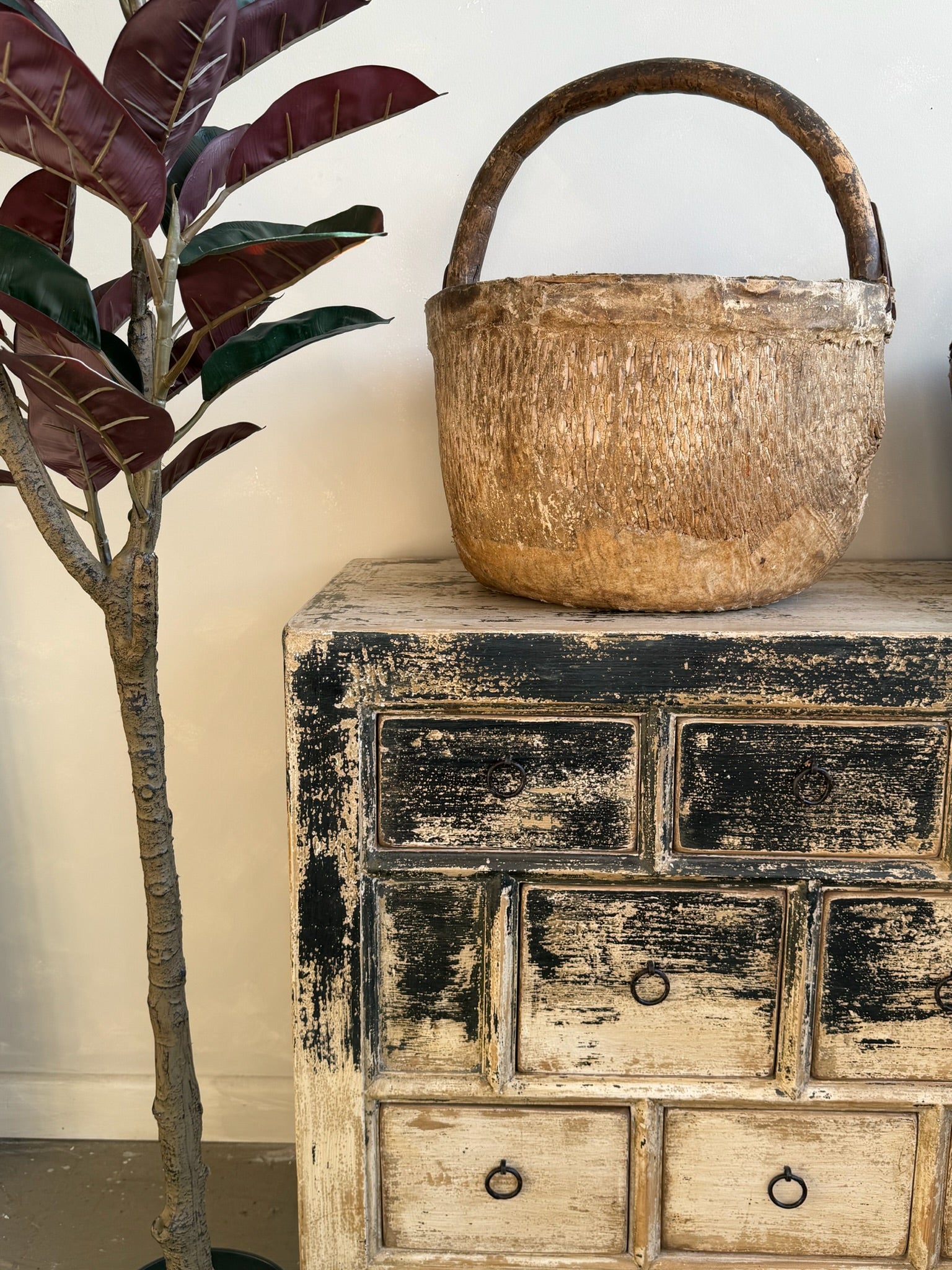 Crafted from solid wood and thoughtfully revived, this one of a kind piece celebrates its storied past. The naturally distressed black and beige finish highlights its age with grace and authentic imperfections reflect decades of history and craftsmanship.