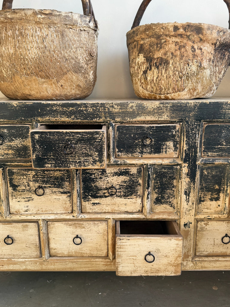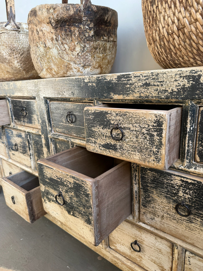 Featuring 17 drawers, each with its own subtle variations and marks of its journey, this cabinet offers both individuality and storage. Its generous proportions make it equally functional and visually striking.