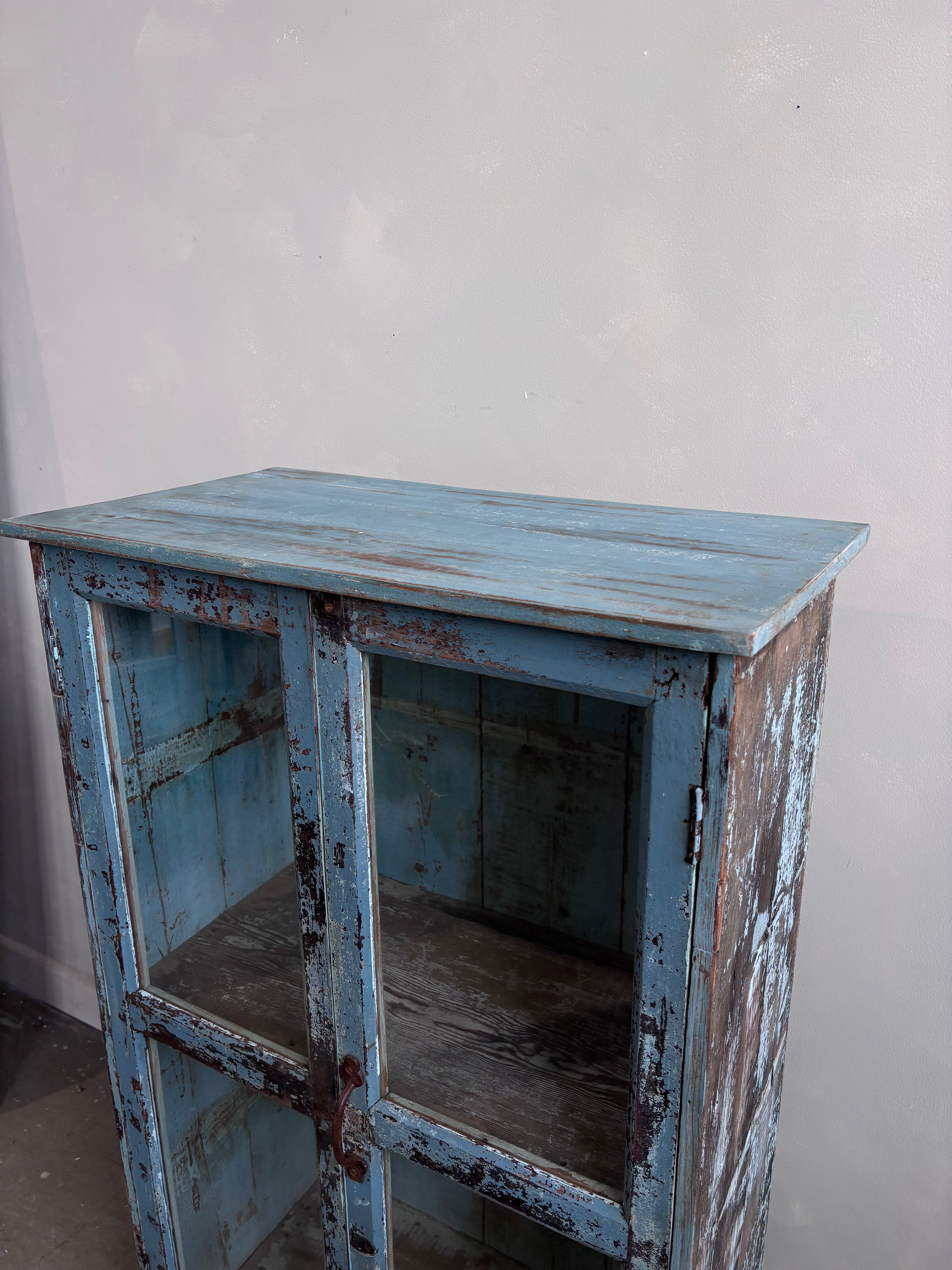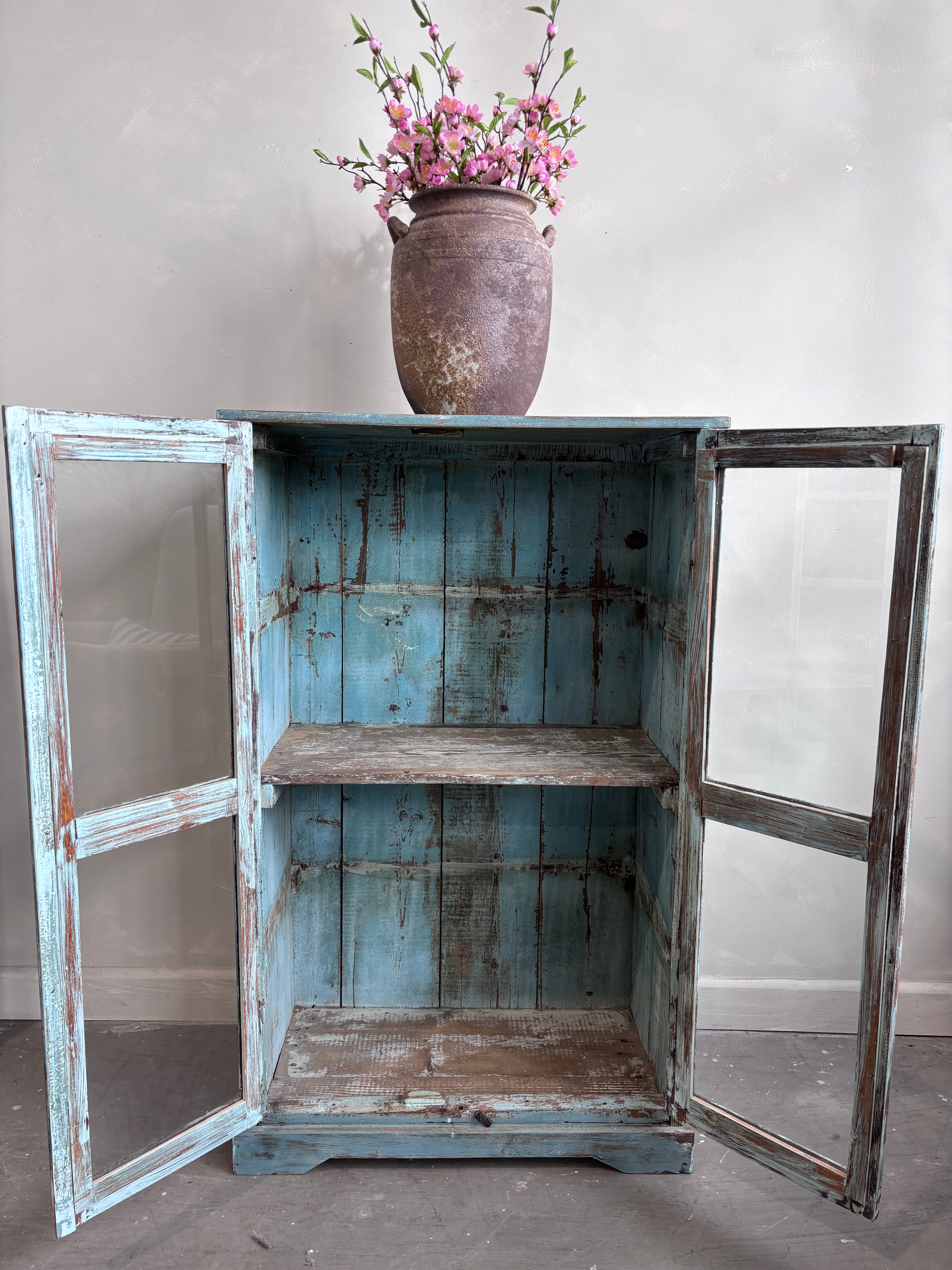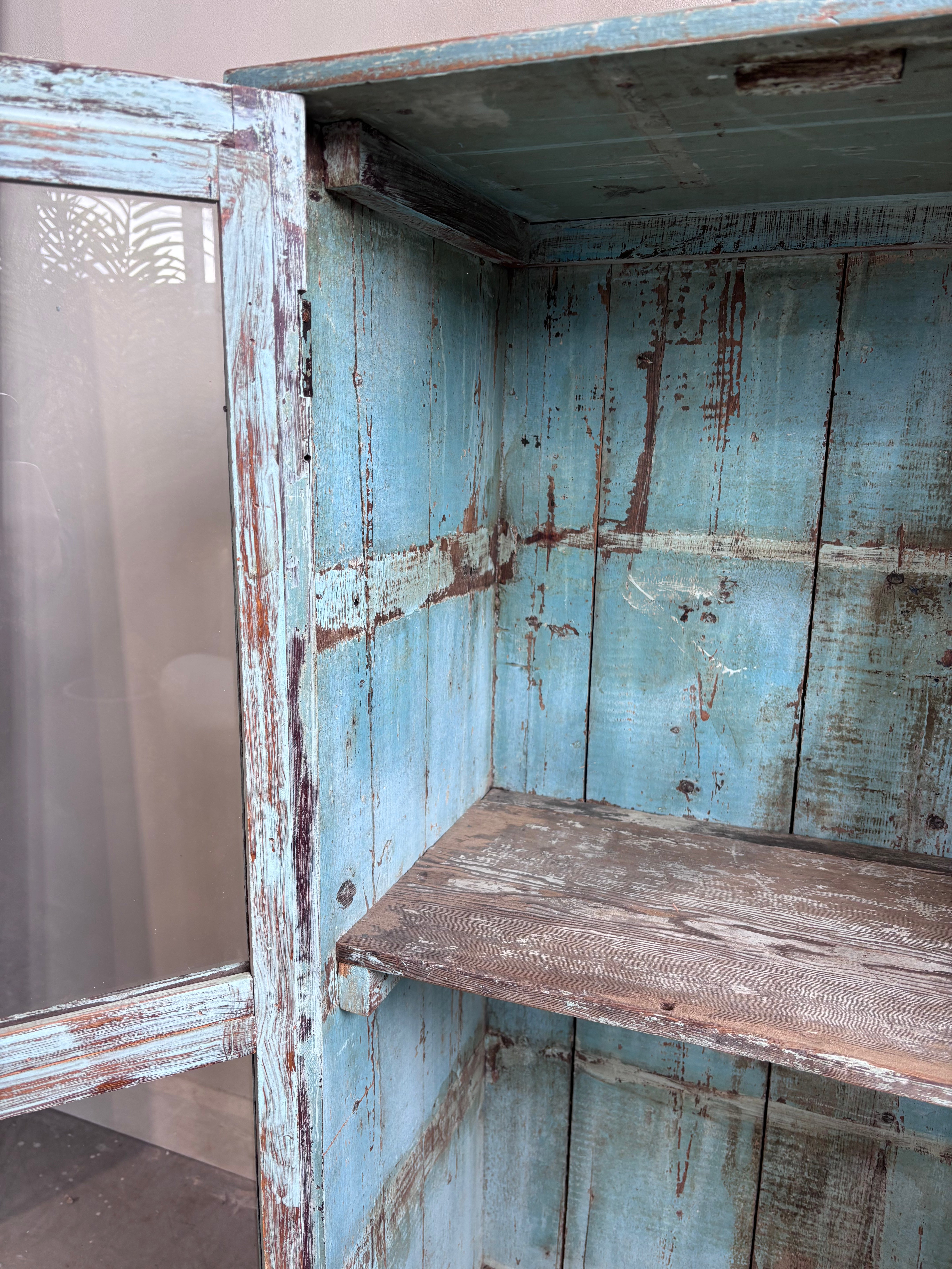 Vintage Indian Pale Blue Cabinet Glass Front Doors