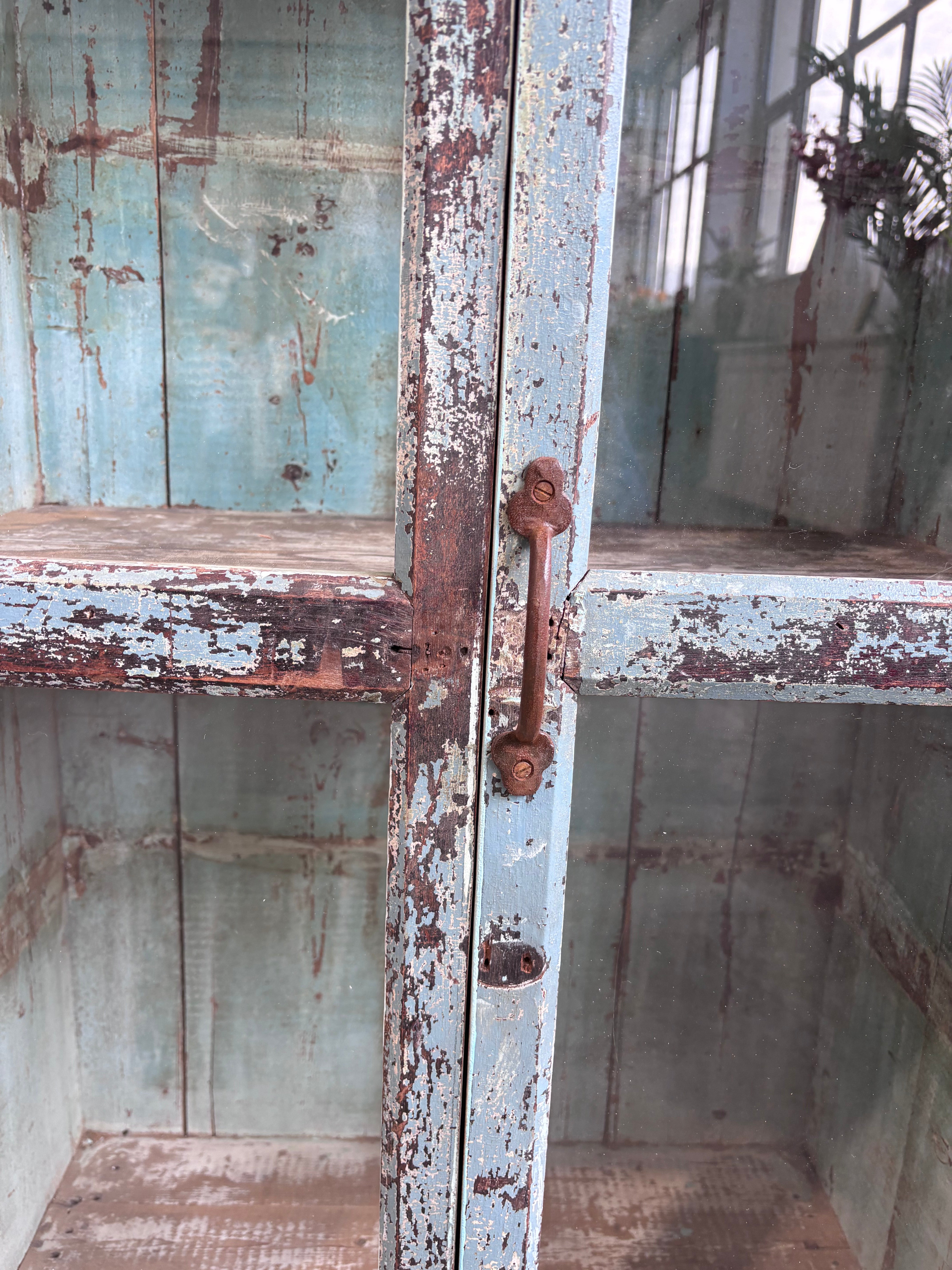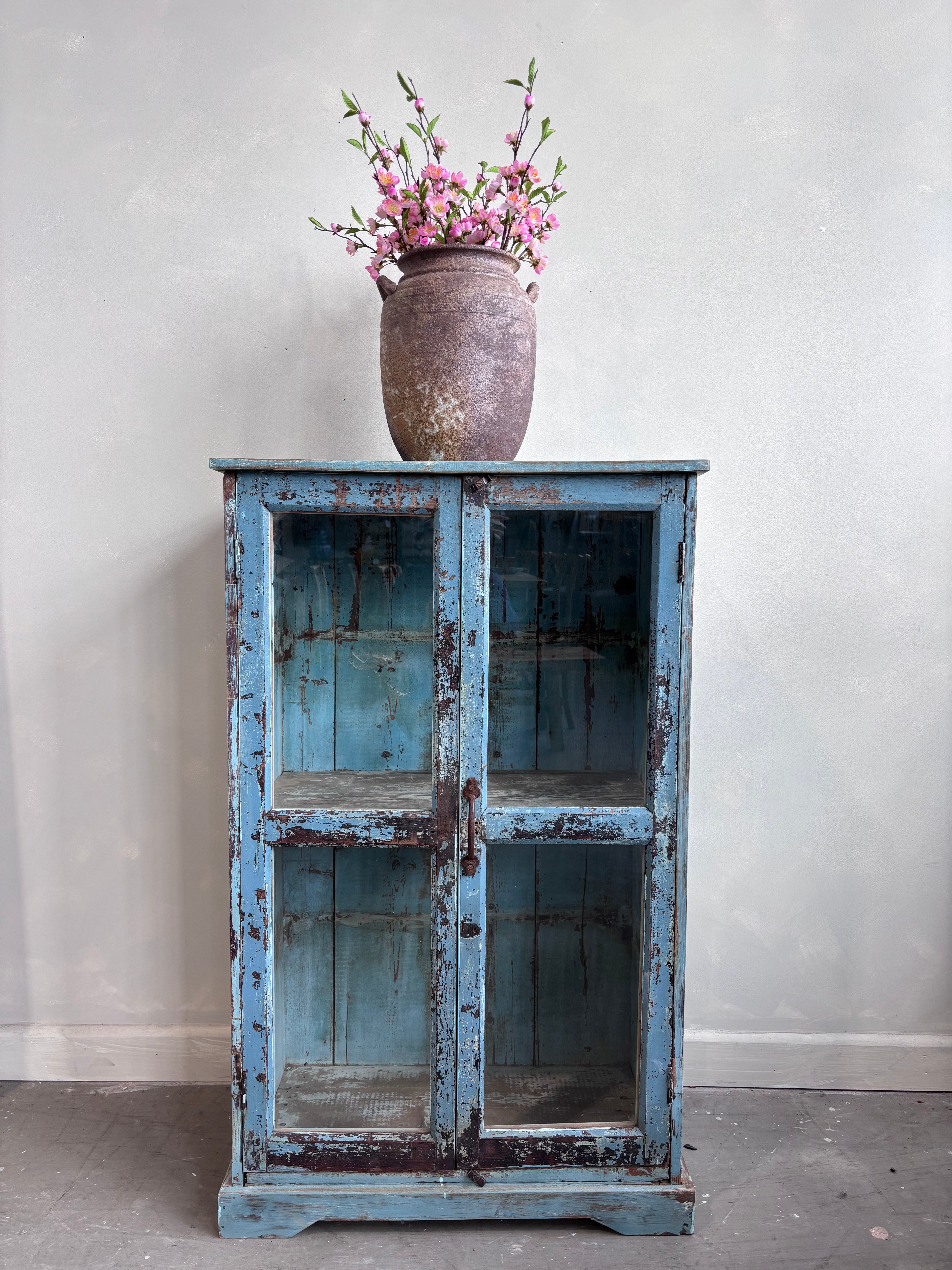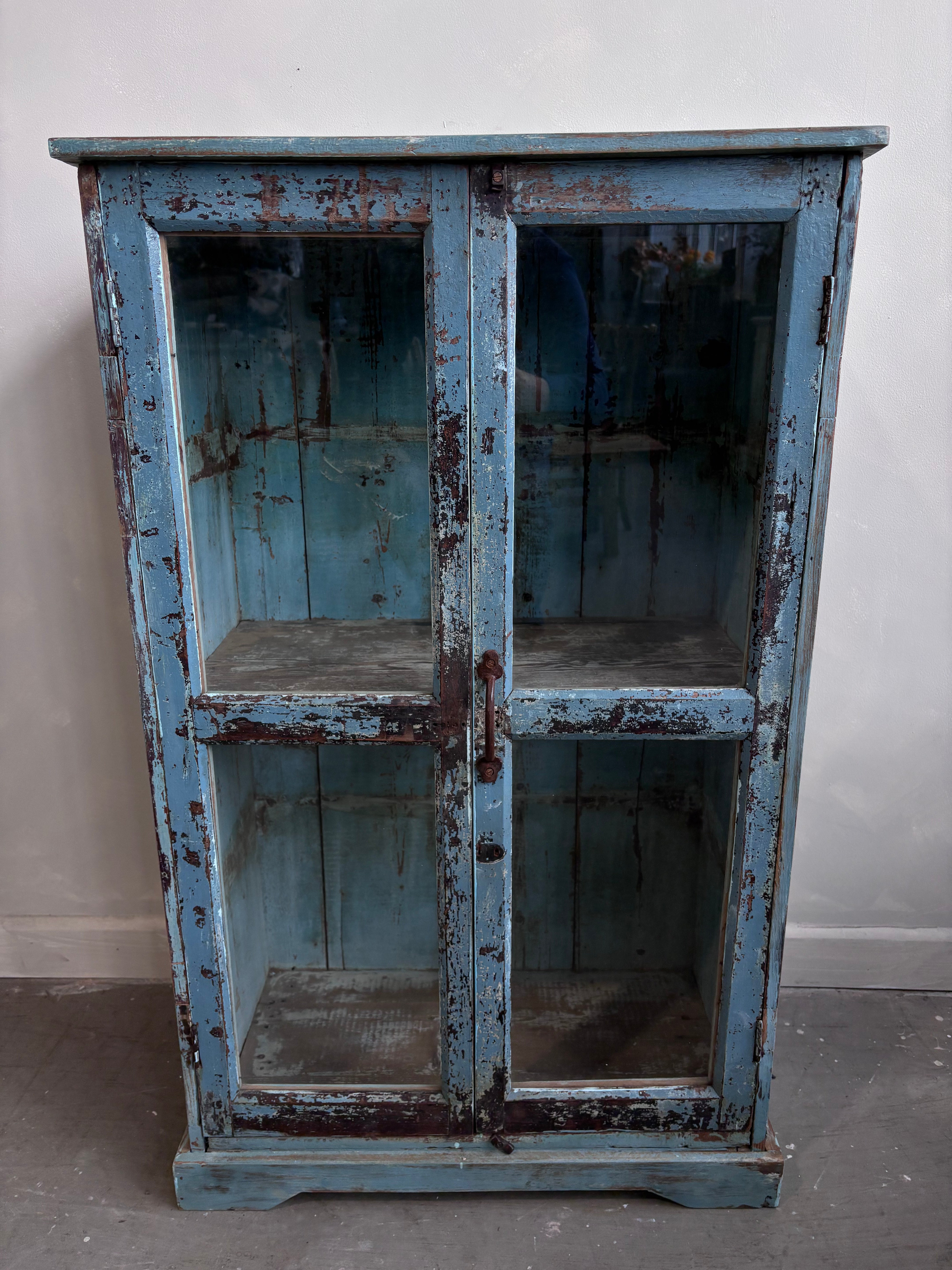 Vintage Indian Pale Blue Cabinet Glass Front Doors