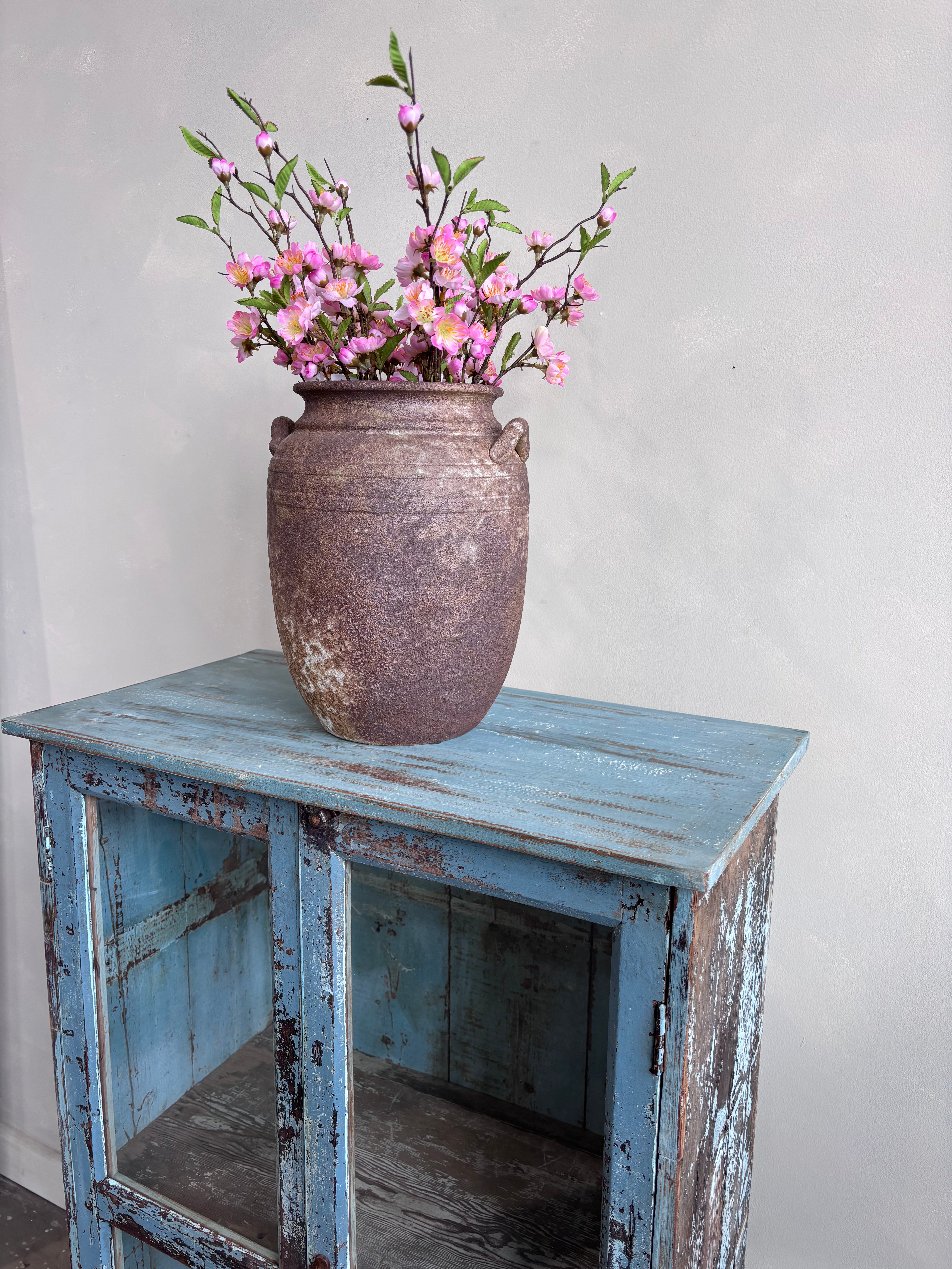 Infuse your home with heritage rich rustic elegance through this Vintage Indian Blue Cupboard, a captivating piece that reflects traditional Indian craftsmanship and rustic soul. Handcrafted from solid wood, with glazed front doors, its weathered blue finish tells a story of age and authenticity, adding depth and warmth to any interior.